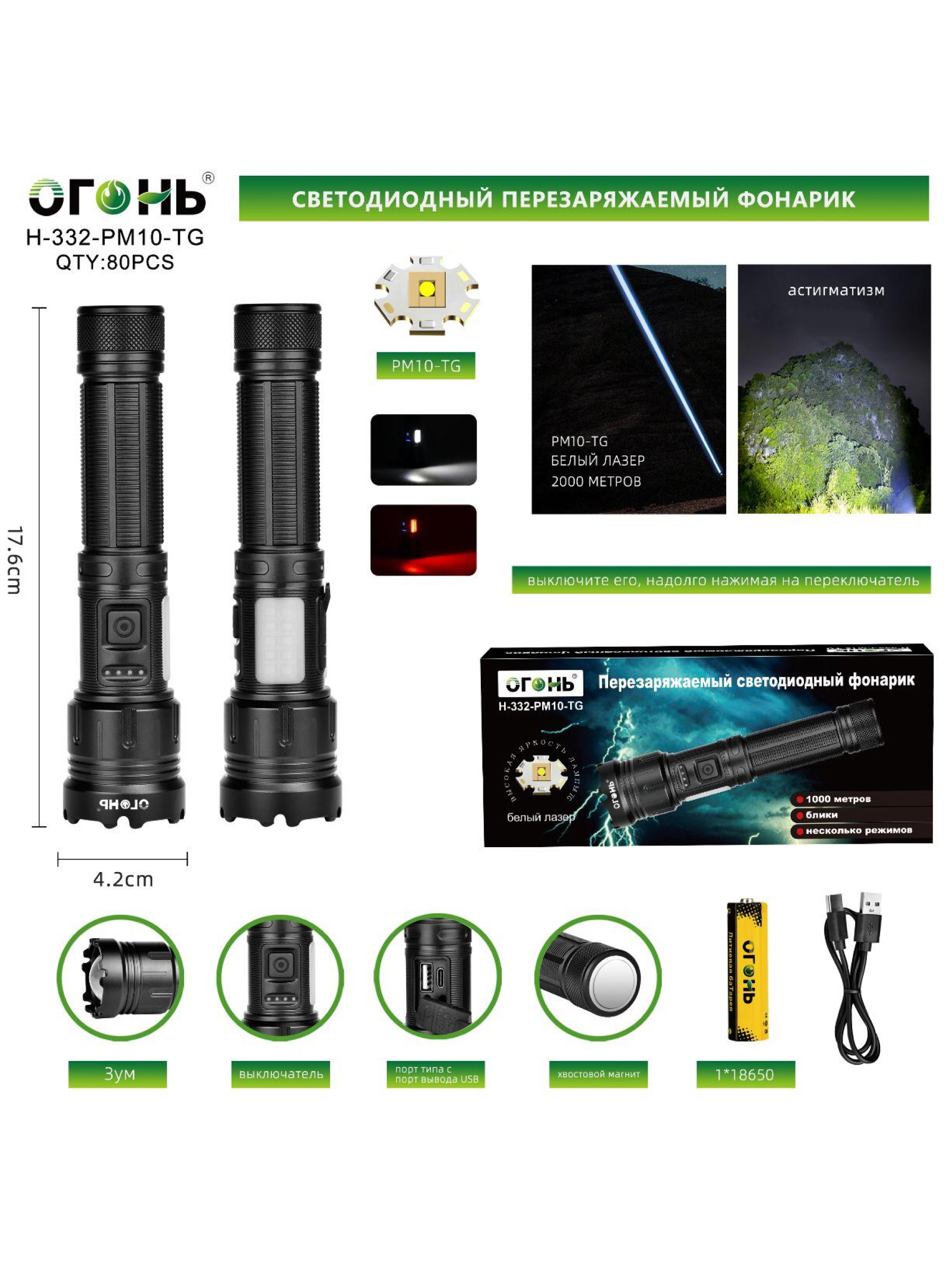Представляем вам светодиодный тактический фонарь Огонь H-332-PM10-TG Zoom — это мощное и надежное устройство, объединяющее передовые технологии и удобство использования в компактном корпусе. Созданный компанией Огонь из Китая, этот фонарь оснащен инновационным источником света PM10-TG, способным освещать расстояния до 2000 метров, что делает его идеальным для профессиональных задач, охоты, походов или спасательных операций.