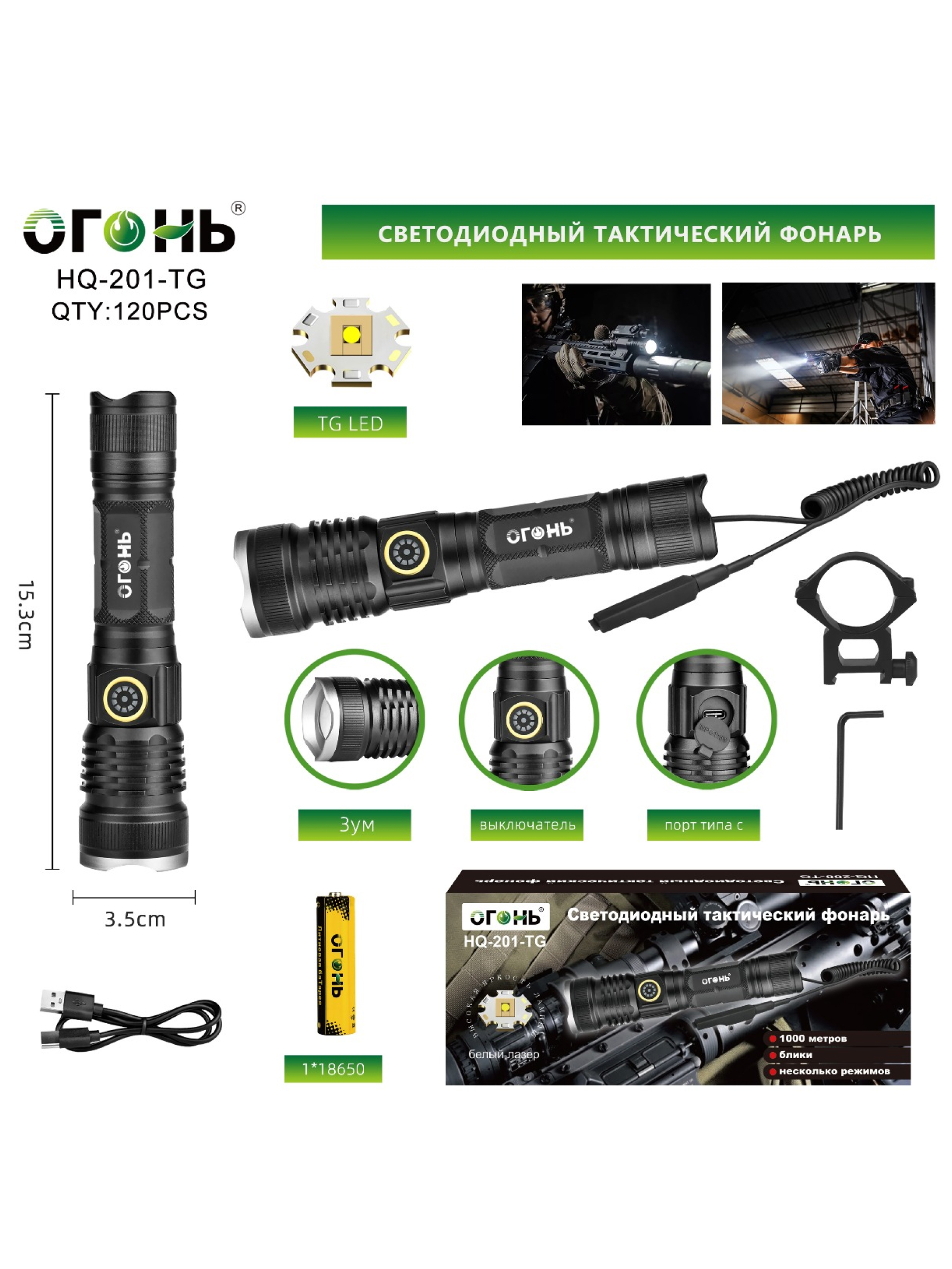 Представляем вам тактический подствольный светодиодный фонарь Огонь HQ-201-TG Zoom — мощный и универсальный инструмент для профессиональных операций, охоты и охранных задач. Этот ручной, карманный фонарь, изготовленный из прочного алюминиевого сплава, обладает ударопрочным корпусом, что обеспечивает надежную работу в самых сложных условиях. Размеры 153 х 35 мм и вес 290 граммов делают его достаточно компактным и удобным для ношения и установки на оружие с помощью крепления Weaver.