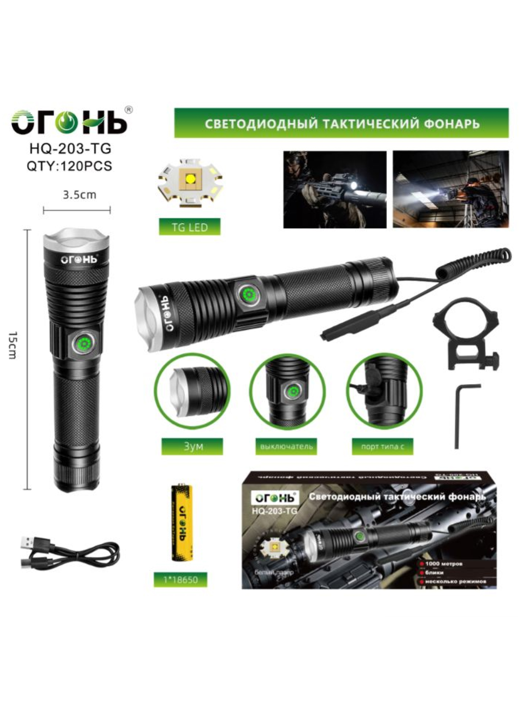 Представляем вам тактический подствольный светодиодный фонарь Огонь HQ-203-TG Zoom — мощный и универсальный инструмент для профессиональных операций, охоты и охранных задач. Этот ручной, карманный фонарь, изготовленный из прочного алюминиевого сплава, обладает ударопрочным корпусом, что обеспечивает надежную работу в самых сложных условиях. Размеры 150 х 35 мм и вес 290 граммов делают его достаточно компактным и удобным для ношения и установки на оружие с помощью крепления Weaver.