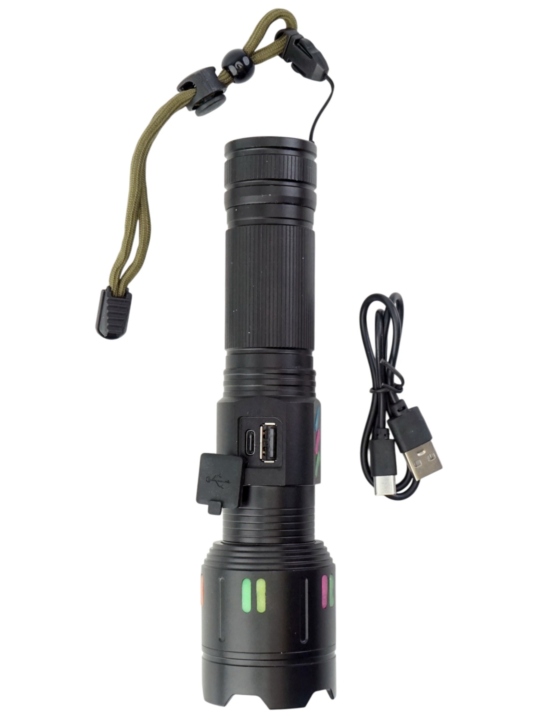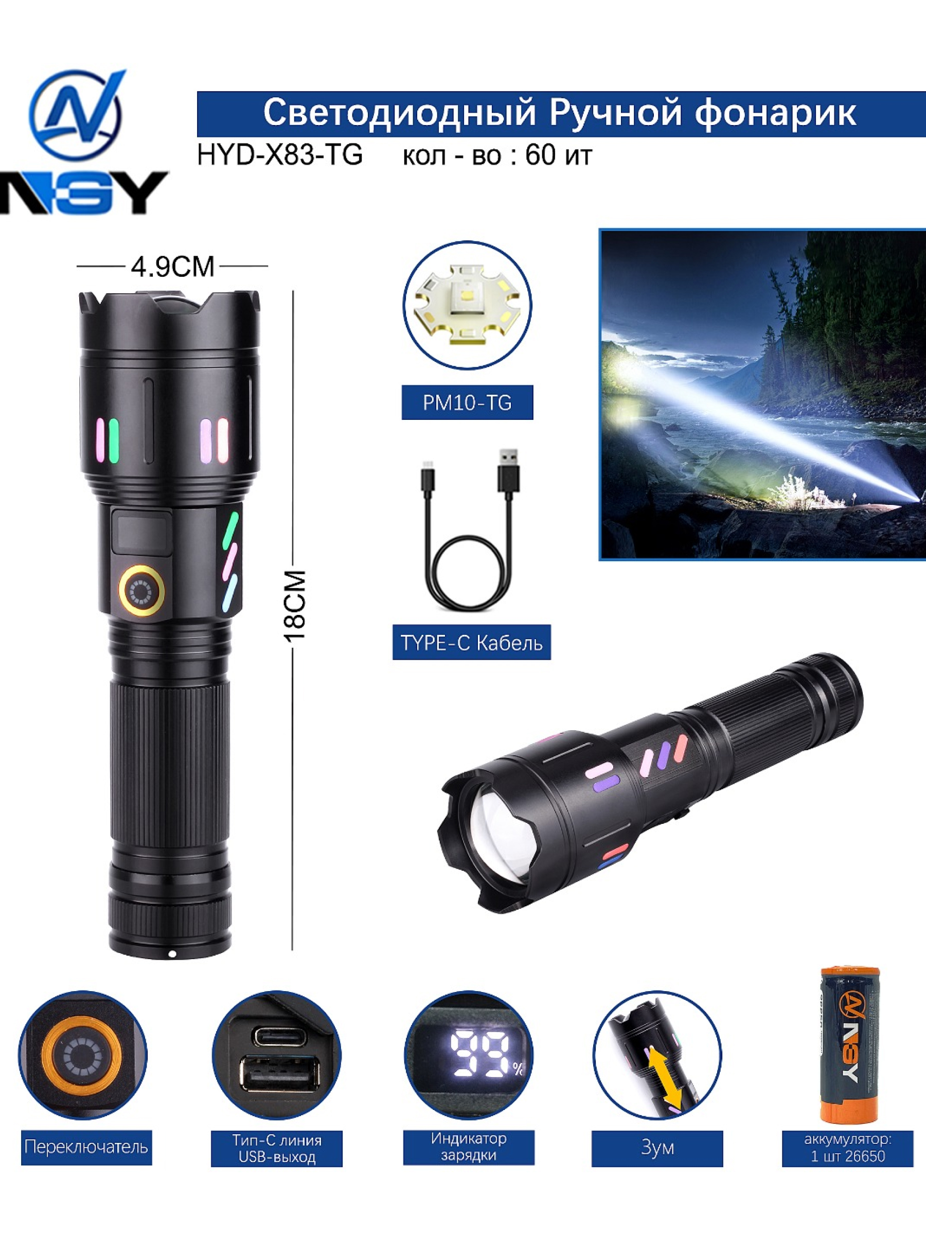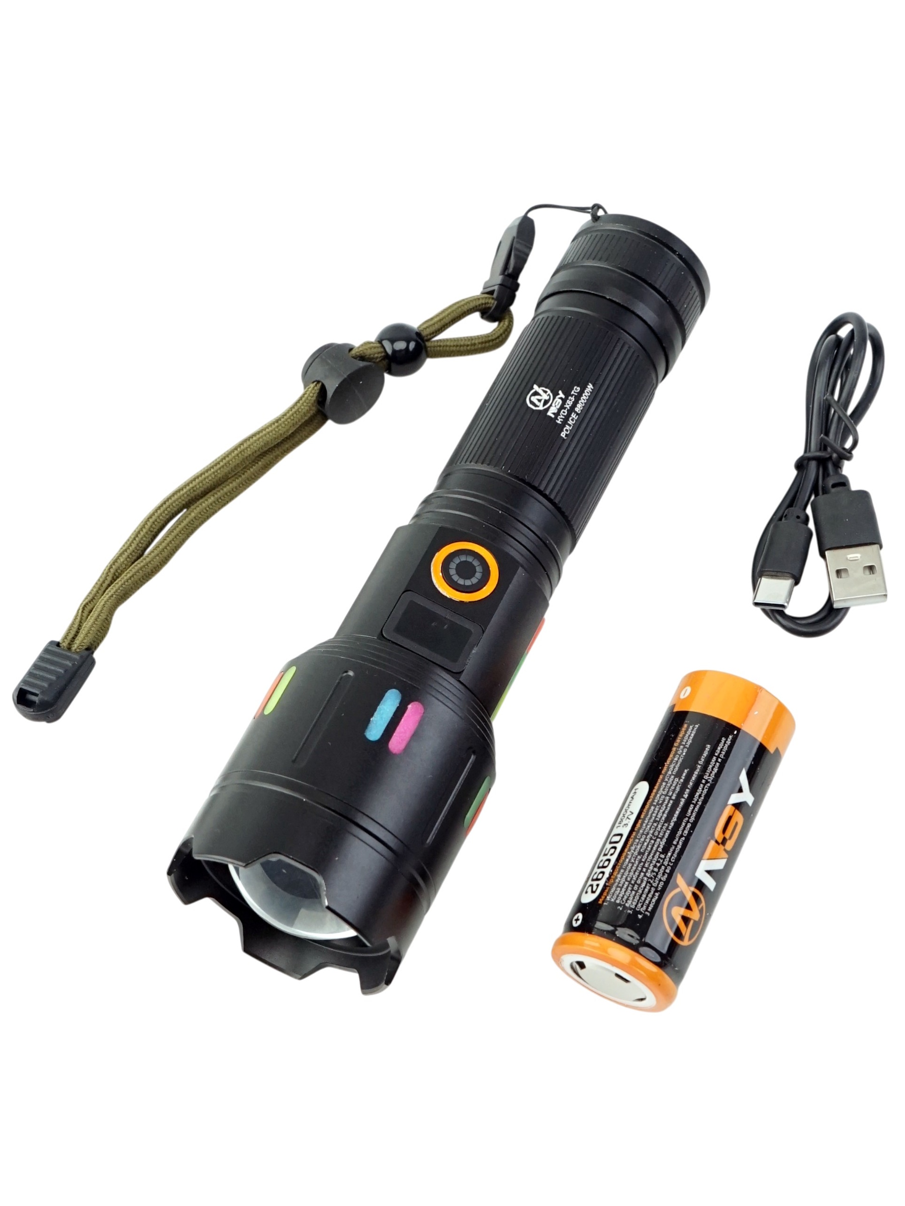 Порт Type-C гарантирует быструю зарядку аккумулятора, а наличие яркой световой индикации и наплывающей флуоресценции делает использование еще более удобным и безопасным в условиях недостаточной освещенности. В комплект входит сам фонарь, аккумулятор, кабель Type-C, инструкция и упаковка — всё подготовлено для немедленного использования. Этот надежный и многофункциональный фонарь отлично подойдет для активных путешествий, охоты, охраны или в чрезвычайных ситуациях, сочетая мощность, инновационные функции и высокое качество исполнения.