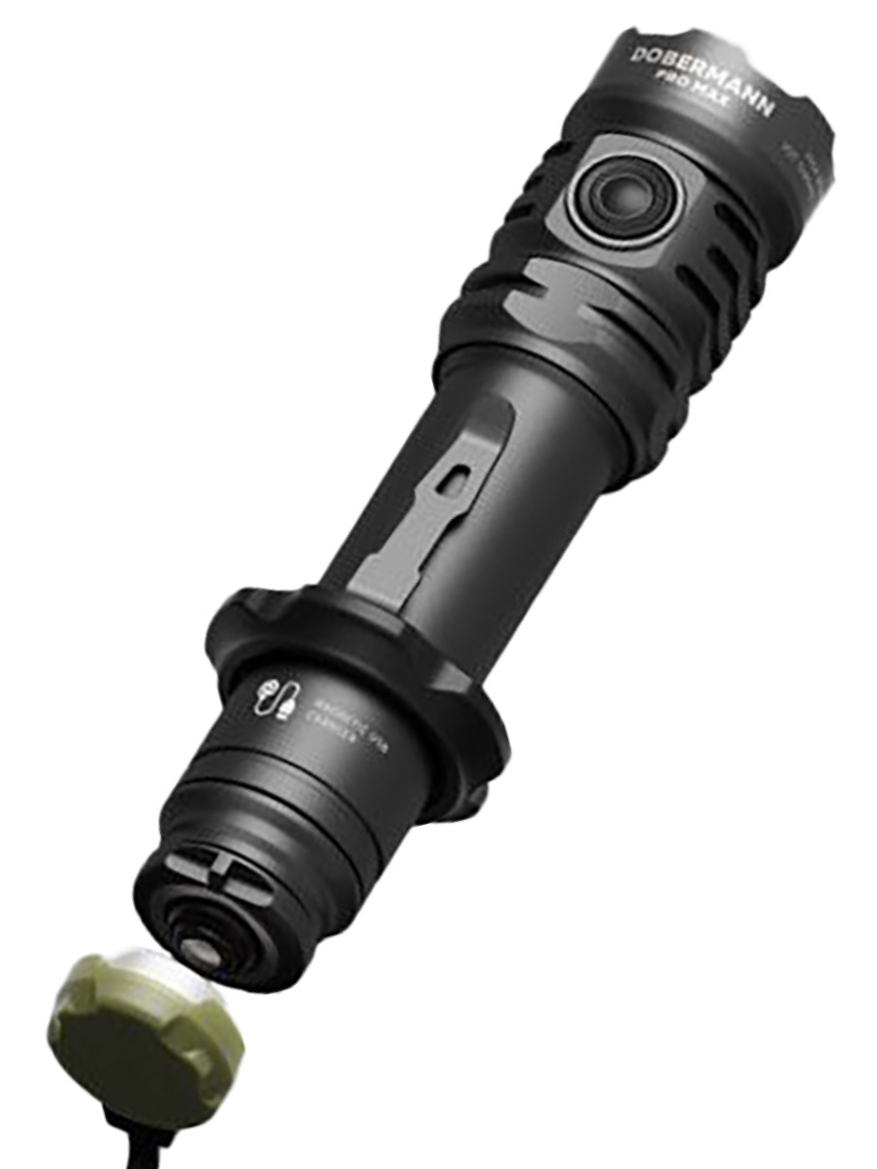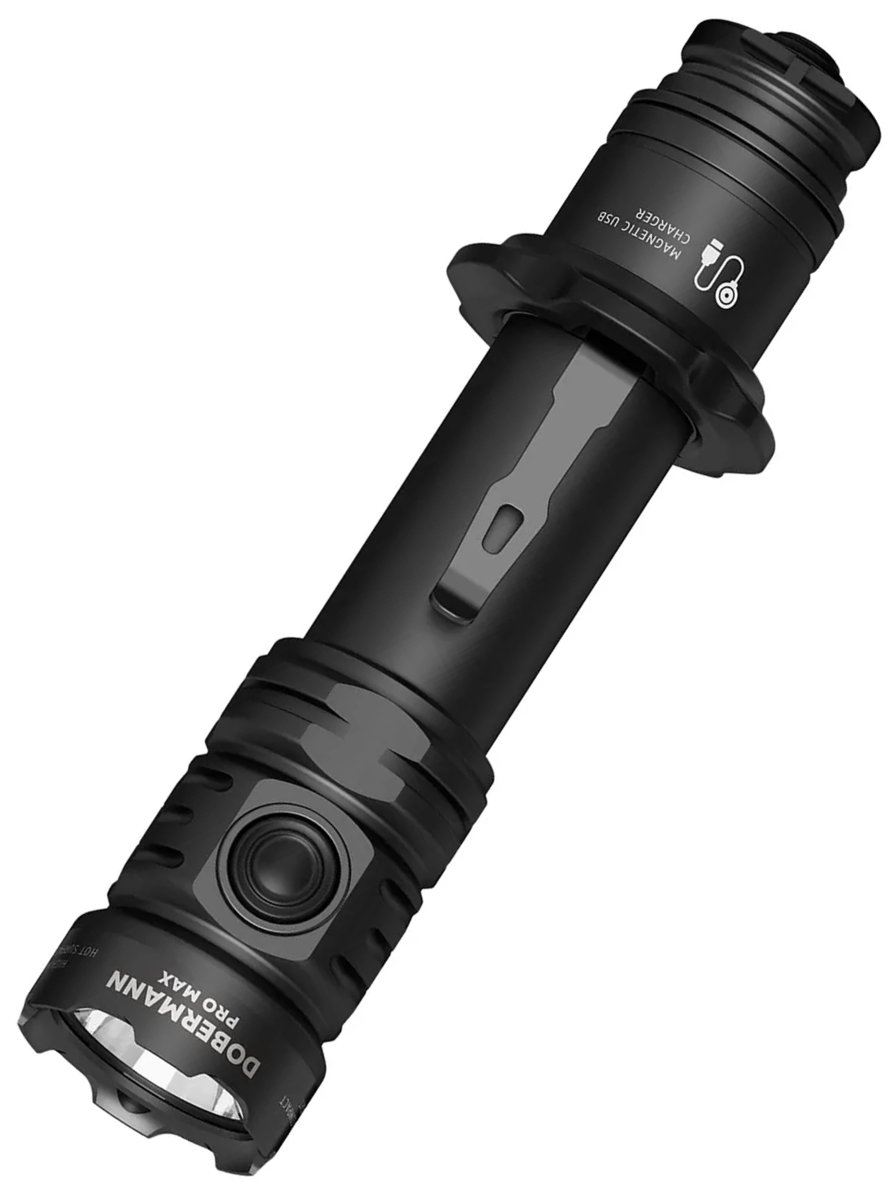 Dobermann Pro Max совместим со специально разработанной магнитной выносной кнопкой и оригинальными креплениями для подствольного применения. Модель работает не только на комплектном элементе питания, но и на любом стандартном аккумуляторе 21700 Li-Ion, а также, благодаря адаптеру, на аккумуляторе 18650 Li-Ion или на двух литиевых батарейках CR123A. Вариативность элементов питания позволяет значительно повысить автономность.