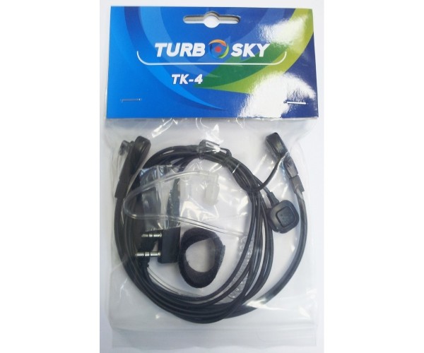 TurboSky TK-4 - наушники с прозрачной аккустической трубкой для портативных моделей радиостанций. Функция "свободные руки", ларингофон с прозрачным звуководом. Кнопка PTT на липучке. Разъем - Kenwood.