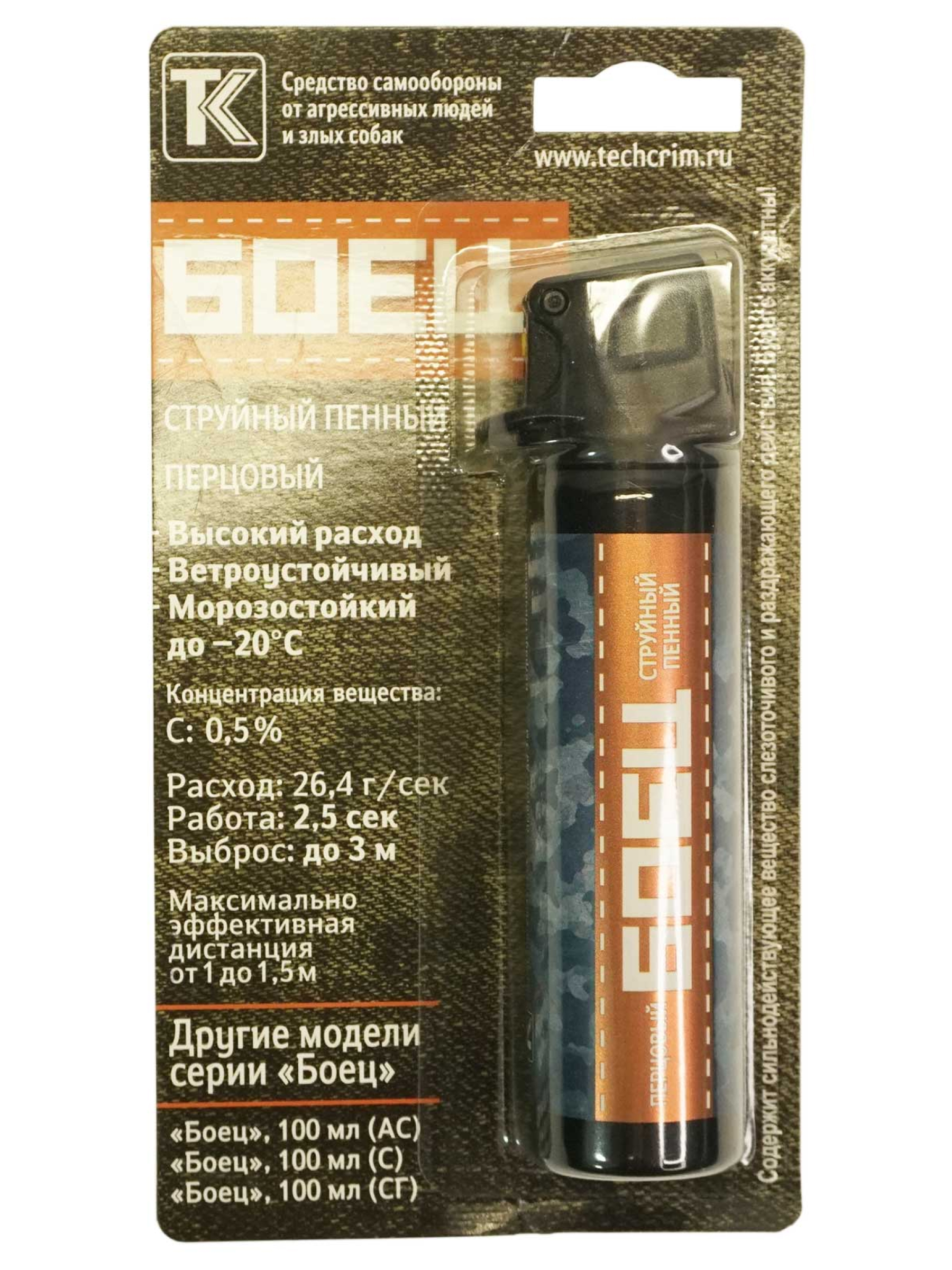 Газовый баллончик «Боец» пенный, 100 мл – это новейшее средство для самозащиты от отечественного производителя «Техкрим», особенно подходящее для использования в закрытых помещениях, что достигается благодаря низкому респираторному эффекту такого типа распыления. Основное активное вещество данного газового баллончика – это экстракт натурального жгучего перца 0,5%. Попадая на кожу злоумышленника, это пенное вещество вызывает невыносимое жжение, а при проникновении в ротовую полость приводит к приступу сильного кашля.