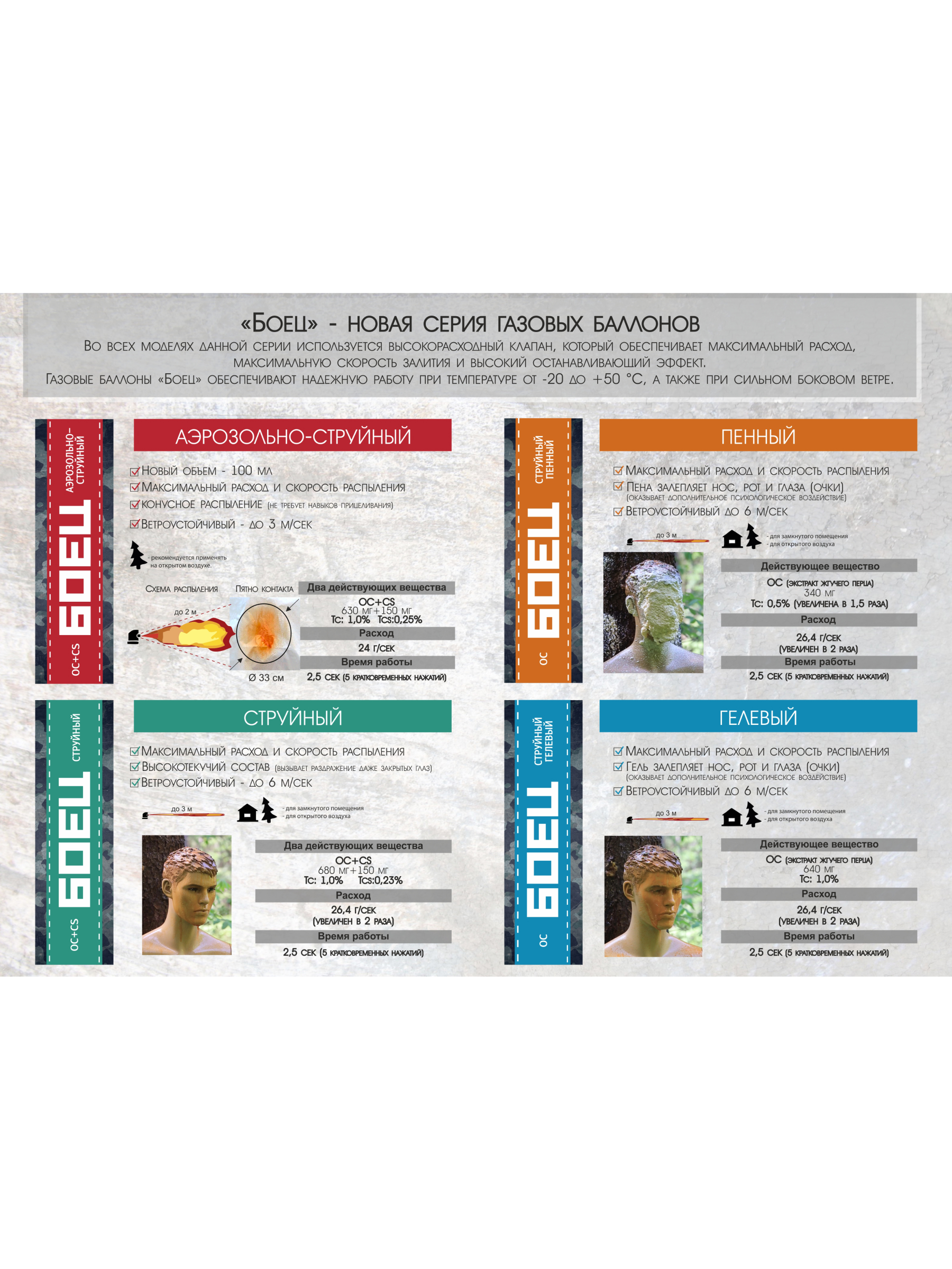Пенное вещество баллончика оказывает также психологическое воздействие на злоумышленника, так как полностью дезориентирует его в пространстве и заставляет отказаться от дальнейших агрессивных действий. Эффективная дальность распыления ирританта составляет 3 метра, показатель его ветроустойчивости – до 6 м/с.
