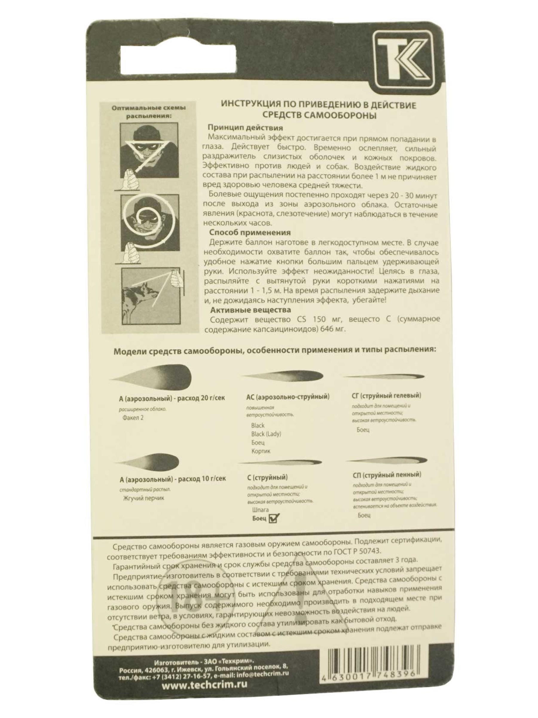 Эффективность струйного баллончика «Боец» достигнута благодаря сочетанию двух газов – перечного экстракта 1% и синтетического «Сирень» 0,23 %. В результате нападающий будет остановлен буквально за 1,5- секунды. Струя едкой жидкости при попадании в глаза и слизистые оболочки лишает противника способности видеть и дает мгновенный болевой эффект. Еще через 1-2 секунды наступает действие перечного экстракта, он оказывает поражающее действие как на зрительную систему, так и на кожные покровы и дыхательную систему злоумышленника.