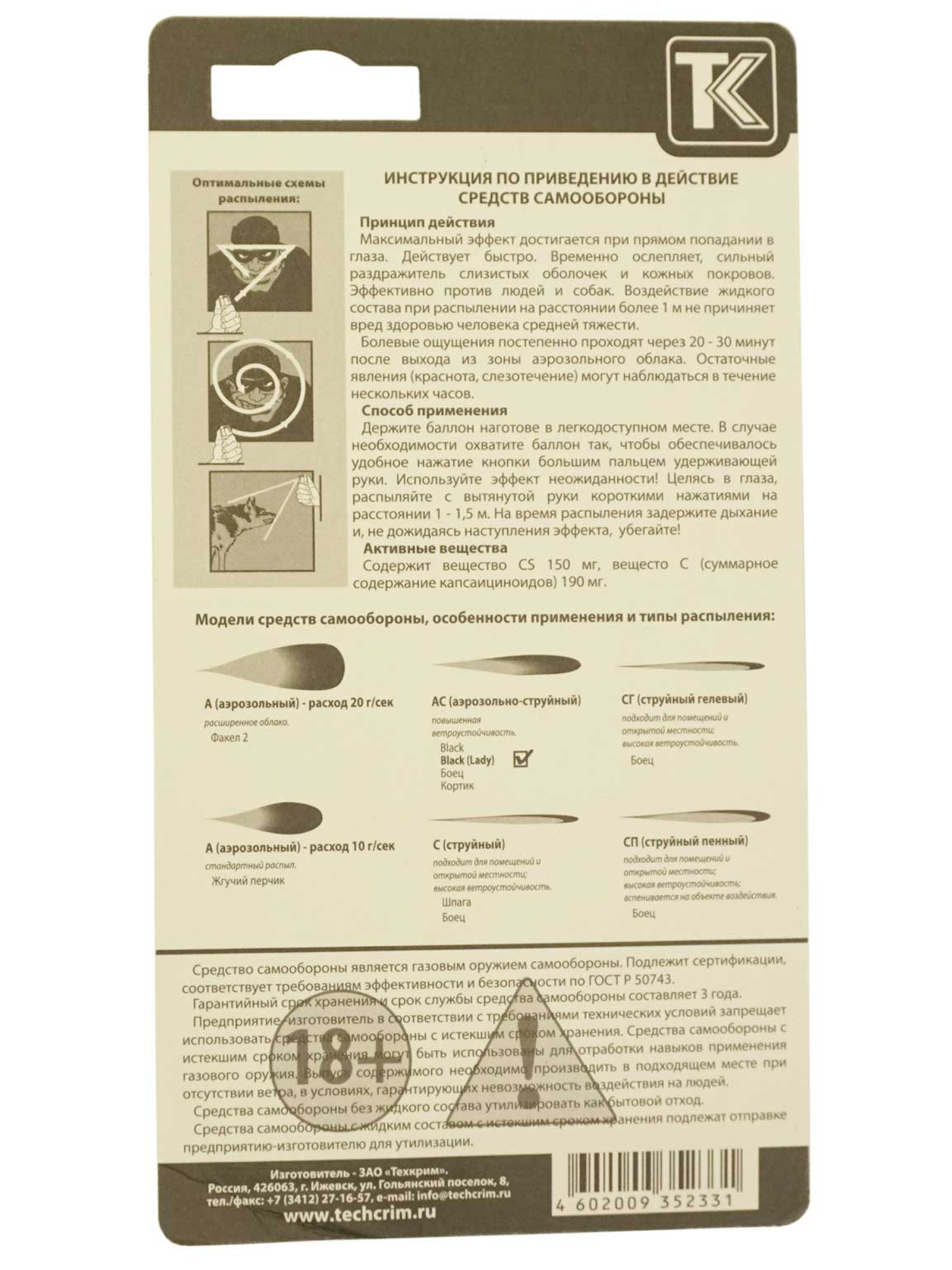 В состав высокоэффективного Lady Black входят 1%-й OC олеорезинкапсикум- 20% или экстракт жгучего перца и 0,83%-й CS полицейский ирритант или синтетическое вещество. Данные вещества способны вывести вашего обидчика из строя на 15-30 минут
