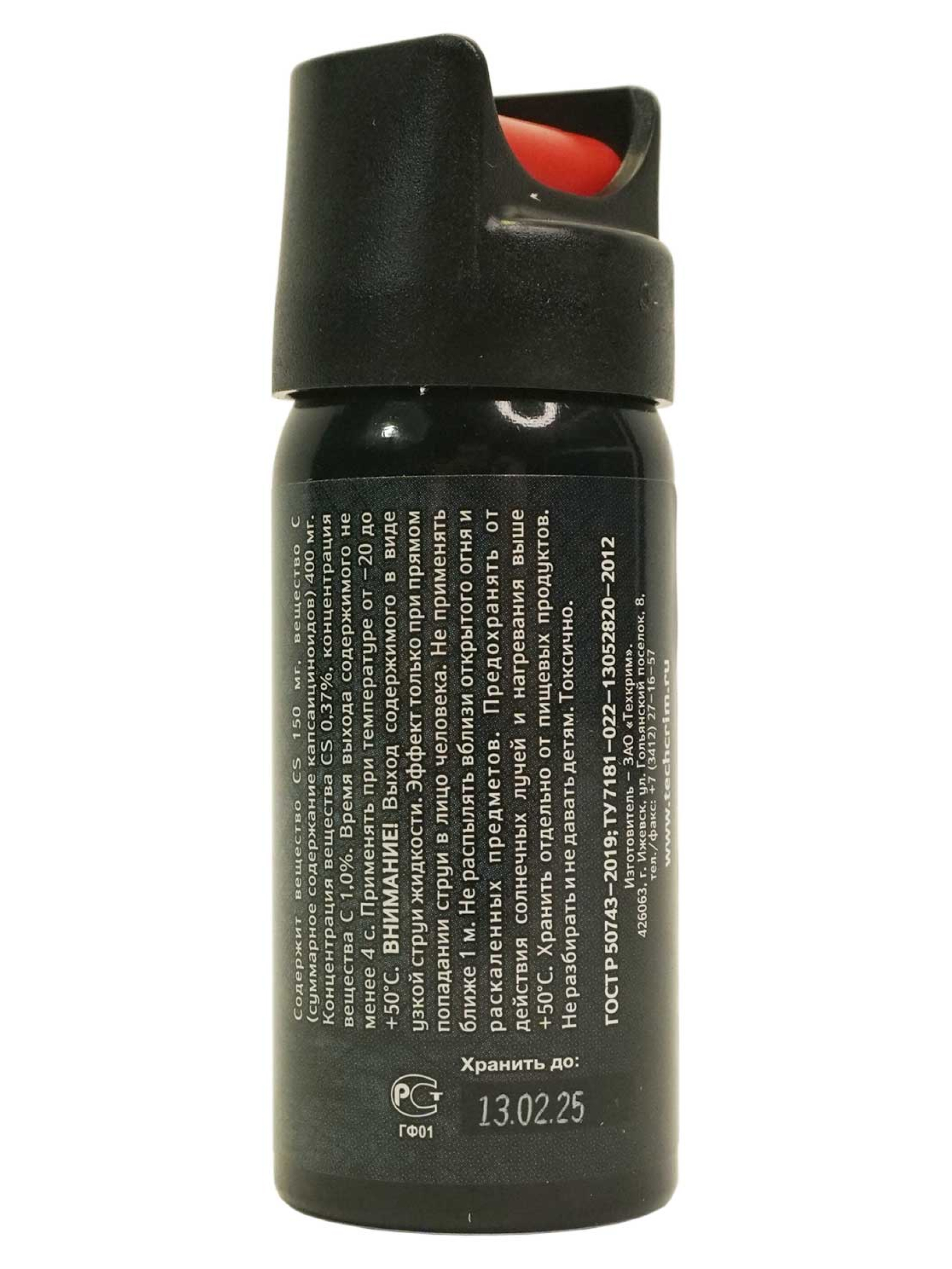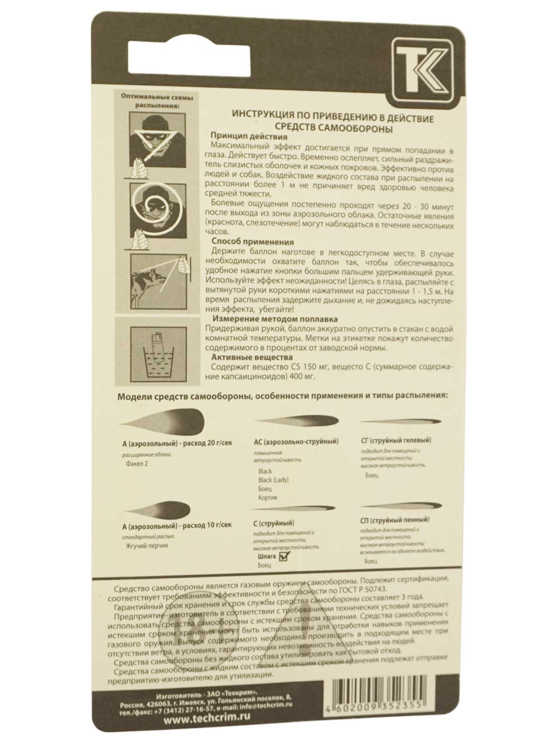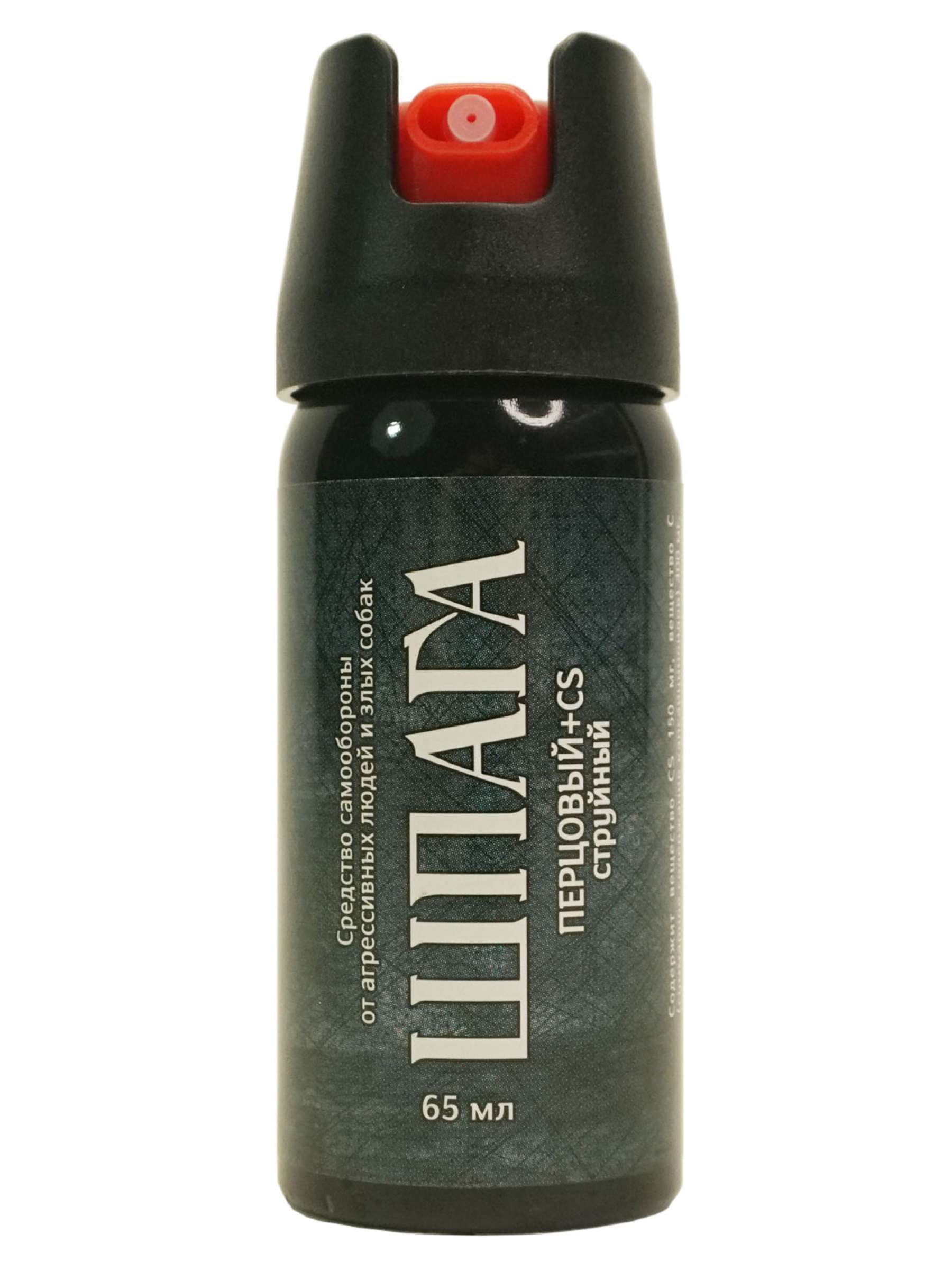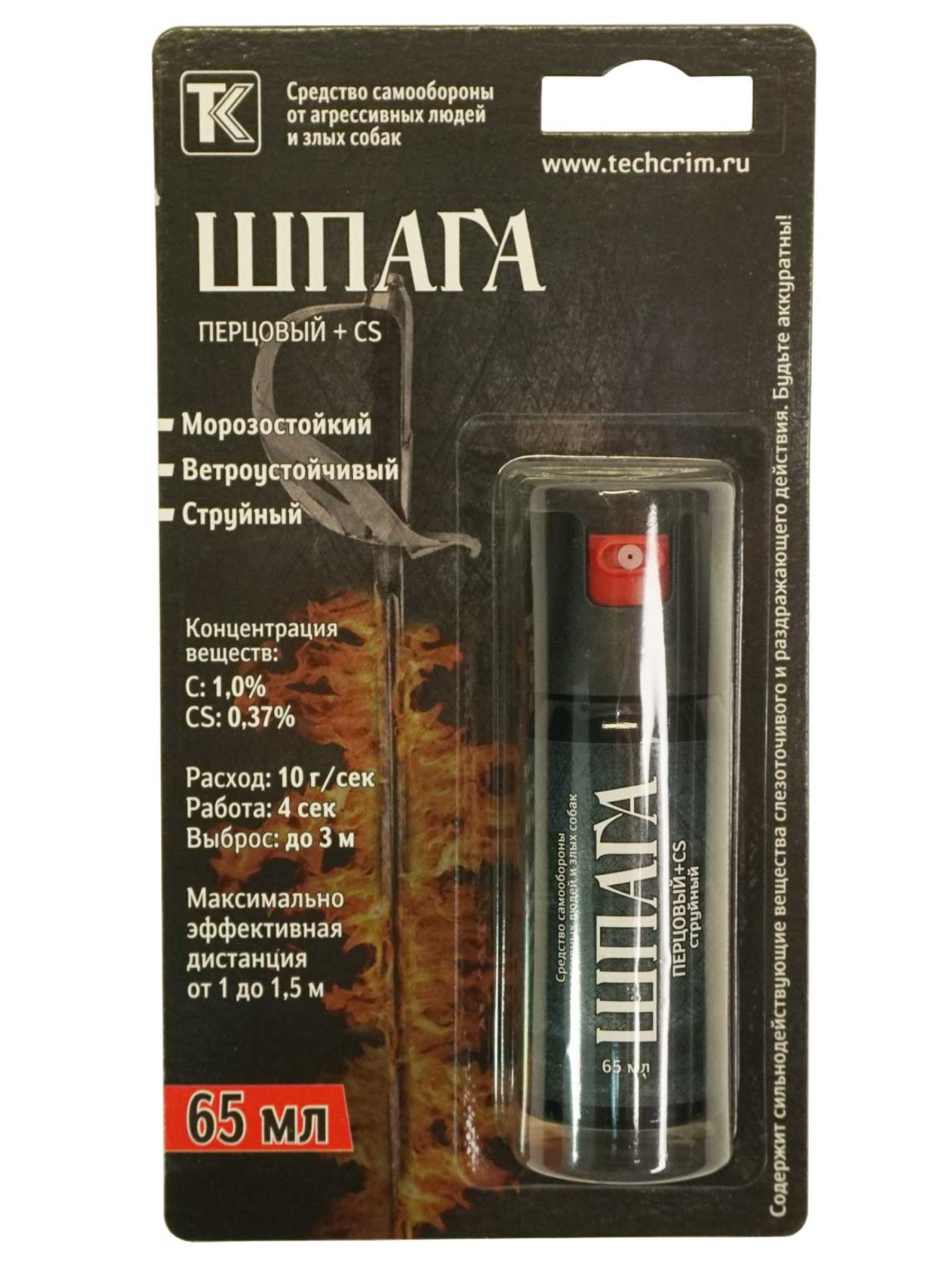 Этим средством поражаются носоглотка, слизистая, дыхательные пути. При этом нападающему причиняются болевые, спазматические, удушающие ощущения с сильным кашлем и чувством жжения. А виной тому наличие в баллончике Шпага, 65 мл 1%-го экстракта жгучего перца, по-другому, OC олеорезинкапсикум в количестве 95% содержимого, а также высокая концентрация 0,38%-го CS, полицейского ирританта – слезоточивого газа. Содержание последнего такое же, как и в баллоне с объемом в 100 мл, а соответственно, этот более концентрированный. Объем баллончика в 65 мл расходуется за 8 кратковременных нажатий или за 4 секунды одного нажатия.
