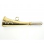 Горн длиной 16 см из латуни с пищиком предназначен для подзыва охотничьей собаки. Встроенный пищик освобождает от необходимости учиться правильно извлекать звук. Каждый охотничий рог имеет индивидуальный тон. На горне есть эмблема в виде головы кабана.