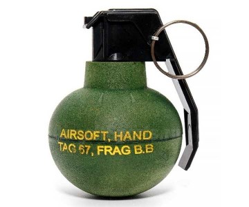 Ручная имитационная граната TAG-67 (шары) снаряжена страйкбольными шариками 0,2 г в количестве примерно 240 штук. Корпус изготовлен из пенополиуретана, наружная поверхность корпуса стилизована под «тяжелый металл». Пироэлемент эквивалентен «Корсару 4». Время замедления: 3-4 секунды. Предохранительное устройство: чека, рычаг. Масса изделия – 120 грамм. Является страйкбольной репликой американской ручной гранаты M67.