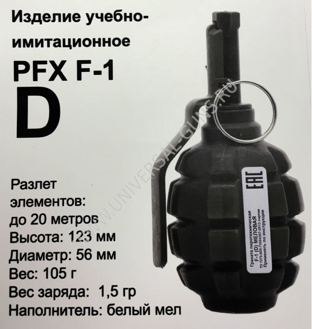 Пиротехнические учебно-имитационные гранаты PFX F1 Dust по своему принципу инициации и работы являются не летальными аналогами российских боевых гранат Ф-1, предназначены для создания мощного акустического эффекта, облака белого пылевого пигмента и отработки навыка применения ручных боевых гранат.