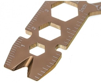 Набор функций: | - плоская отвертка - скребок / гвоздодер - линейка (3.5 см) - открывалка для бутылок - велосипедный ключ - торцевой ключ (держатель бит) 3/8", 5/16", 7/32" - отверстие для темляка или крепления инструмента на кольцо, карабин |