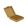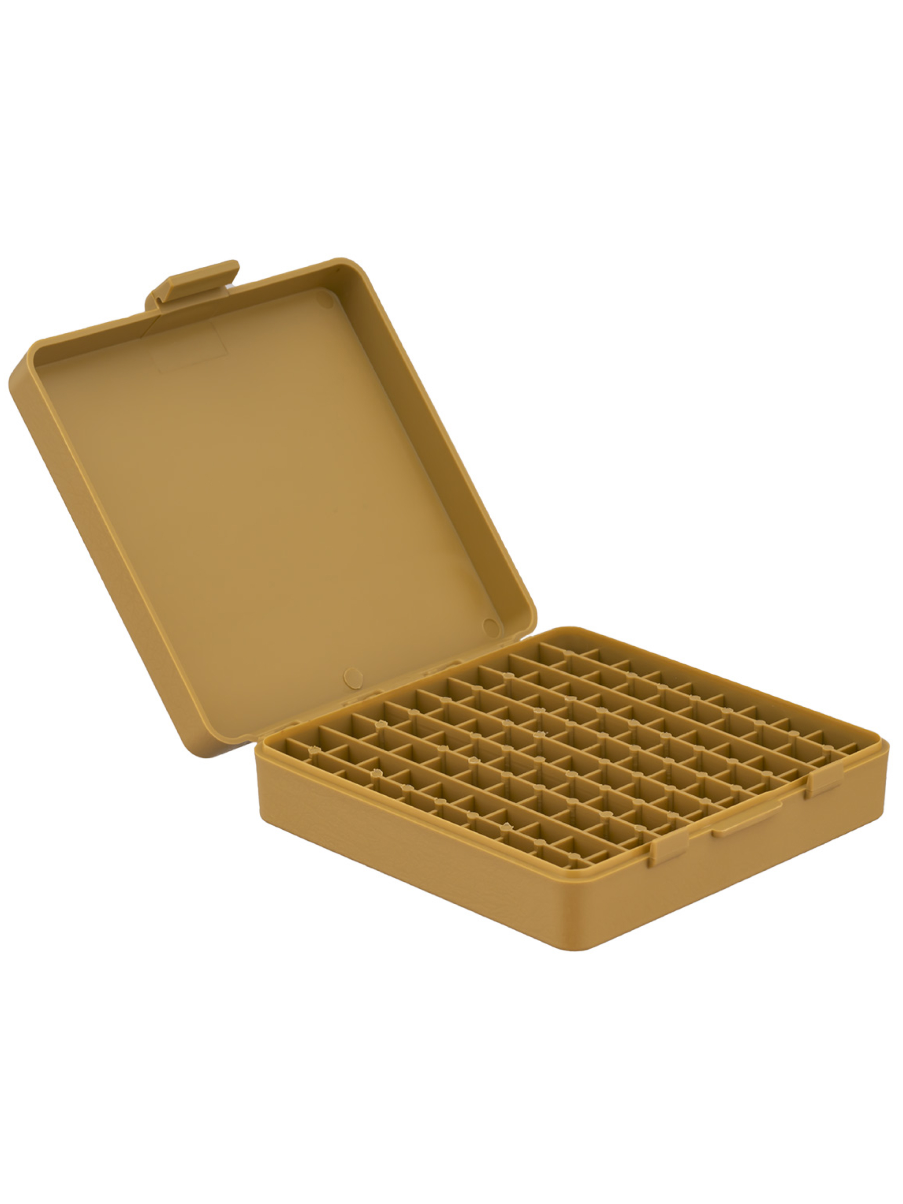 Непрозрачный корпус кейса скрывает содержимое от посторонних. На этикетке кейса указаны подходящие калибры патронов. Благодаря пазам на крышке и дне, кейсы можно устанавливать друг на друга для удобного хранения в оружейном сейфе.