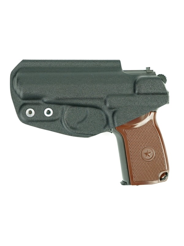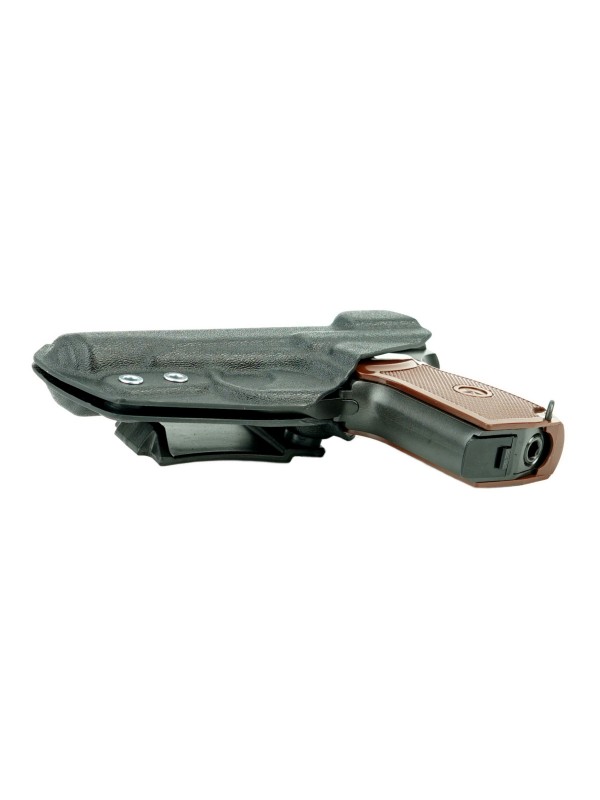 Удержание пистолета в кобуре происходит за спусковую скобу. Регулировка жесткости удержания регулируется винтами, установленными с внешней стороны кобуры.