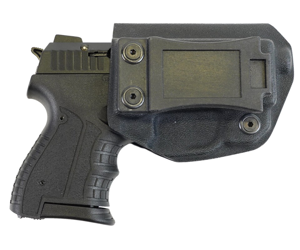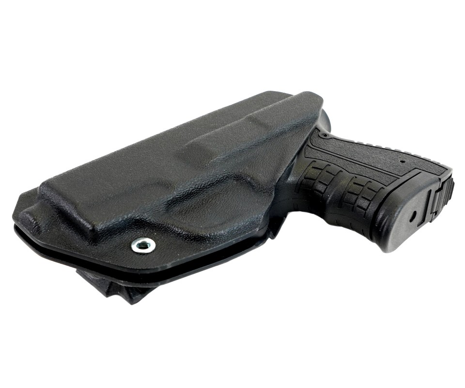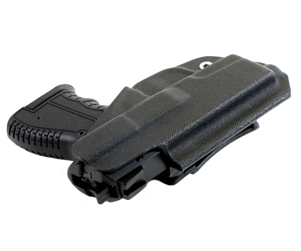 Удержание пистолета в кобуре происходит за спусковую скобу. Регулировка жесткости удержания регулируется винтами, установленными с внешней стороны кобуры.
