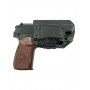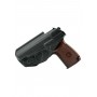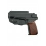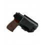 Удержание пистолета в кобуре происходит за спусковую скобу. Регулировка жесткости удержания регулируется винтами, установленными с внешней стороны кобуры.