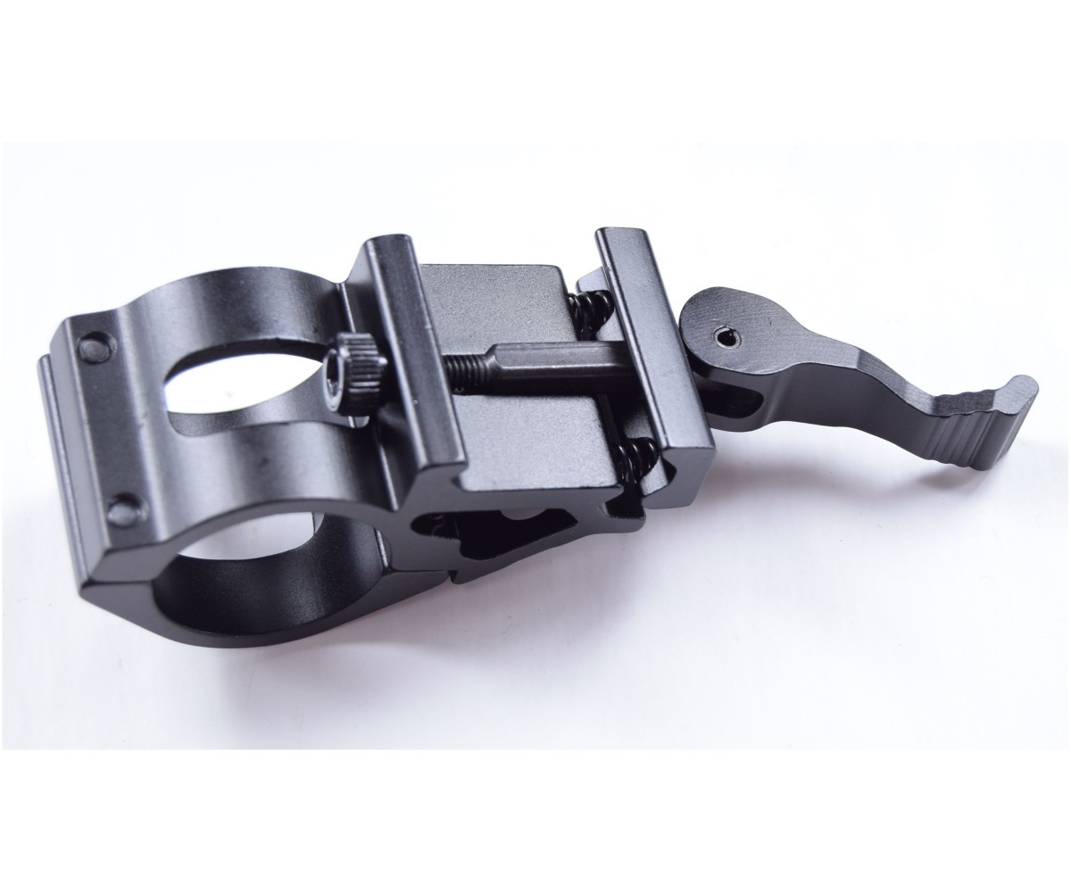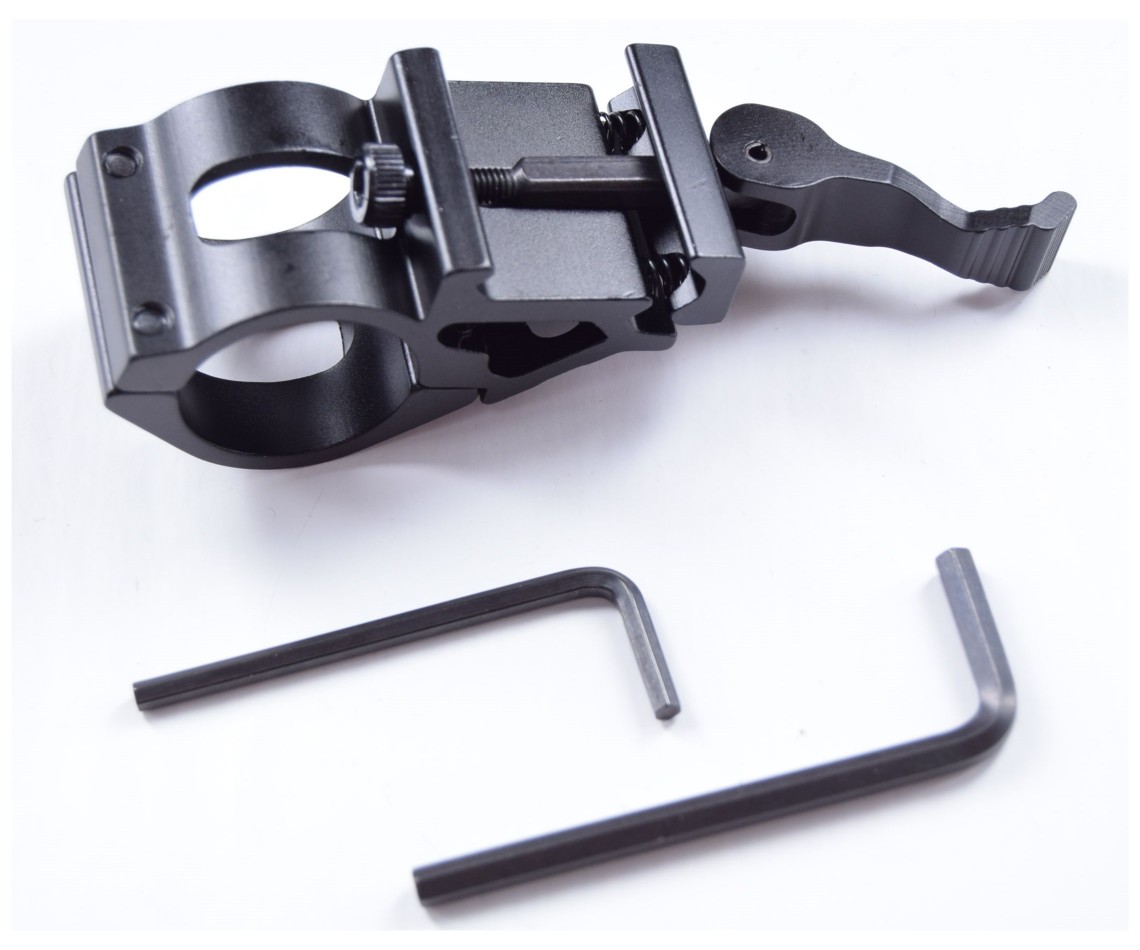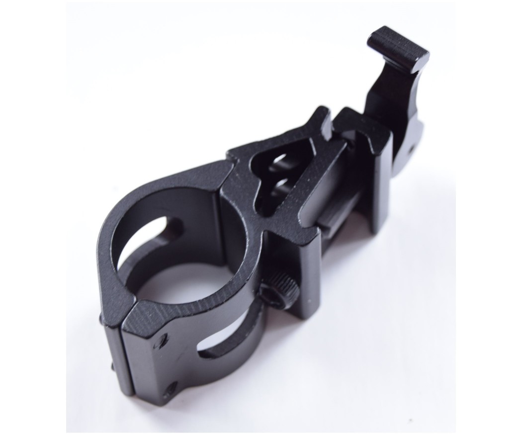 P24-0107 – кольцо (боковой кронштейн) позволяет закрепить на оружие тактический фонарь или лазерный целеуказатель с диаметром обжима 25,4 мм, устанавливается на планку Weaver. Корпус выполнен из алюминиевого сплава, поверхность анодирована, устойчива к коррозии. Кронштейн быстросъемный, фиксируется на базе оружия с помощью специальной лапки, кольцо фиксируется двумя винтиками с каждой стороны.