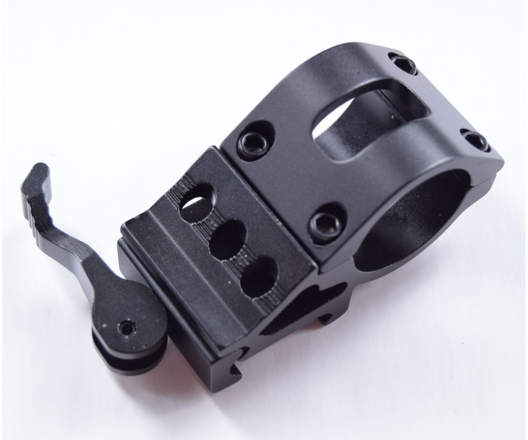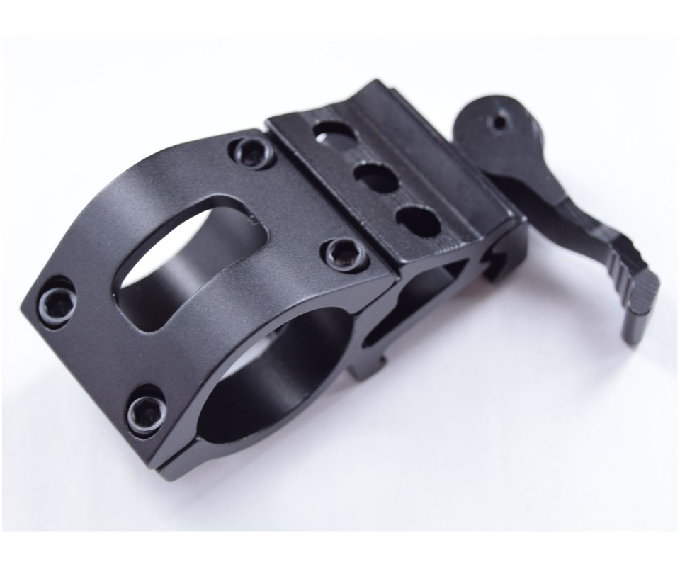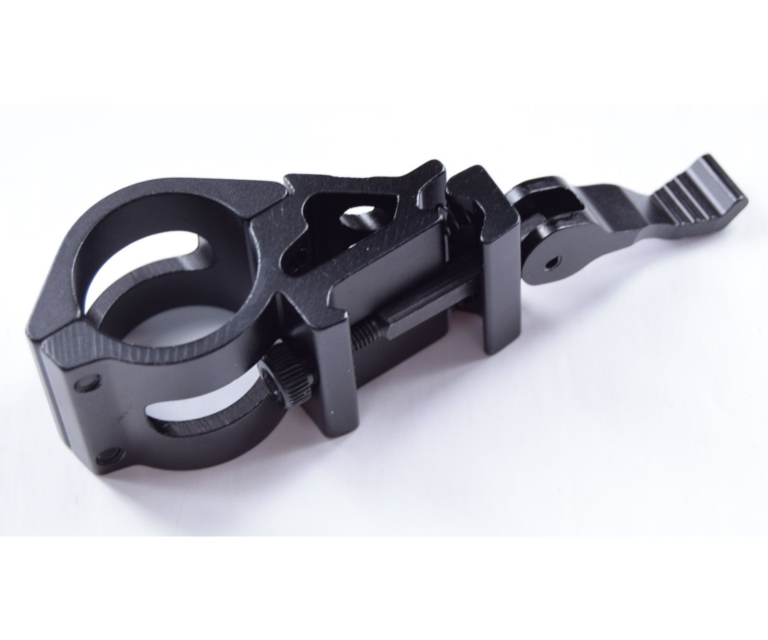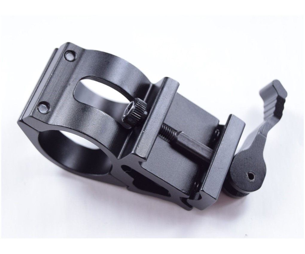 P24-0107 – кольцо (боковой кронштейн) позволяет закрепить на оружие тактический фонарь или лазерный целеуказатель с диаметром обжима 25,4 мм, устанавливается на планку Weaver. Корпус выполнен из алюминиевого сплава, поверхность анодирована, устойчива к коррозии. Кронштейн быстросъемный, фиксируется на базе оружия с помощью специальной лапки, кольцо фиксируется двумя винтиками с каждой стороны.
