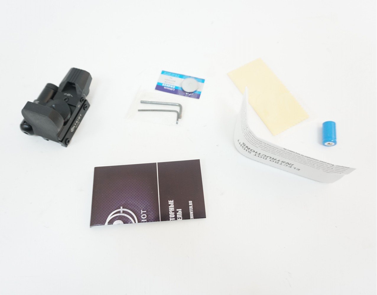 Комплектация (?): | прицел, лазерный целеуказатель, батарейка CR2032, микрофибра для протирки линз, шестигранный ключ, инструкция, коробка |