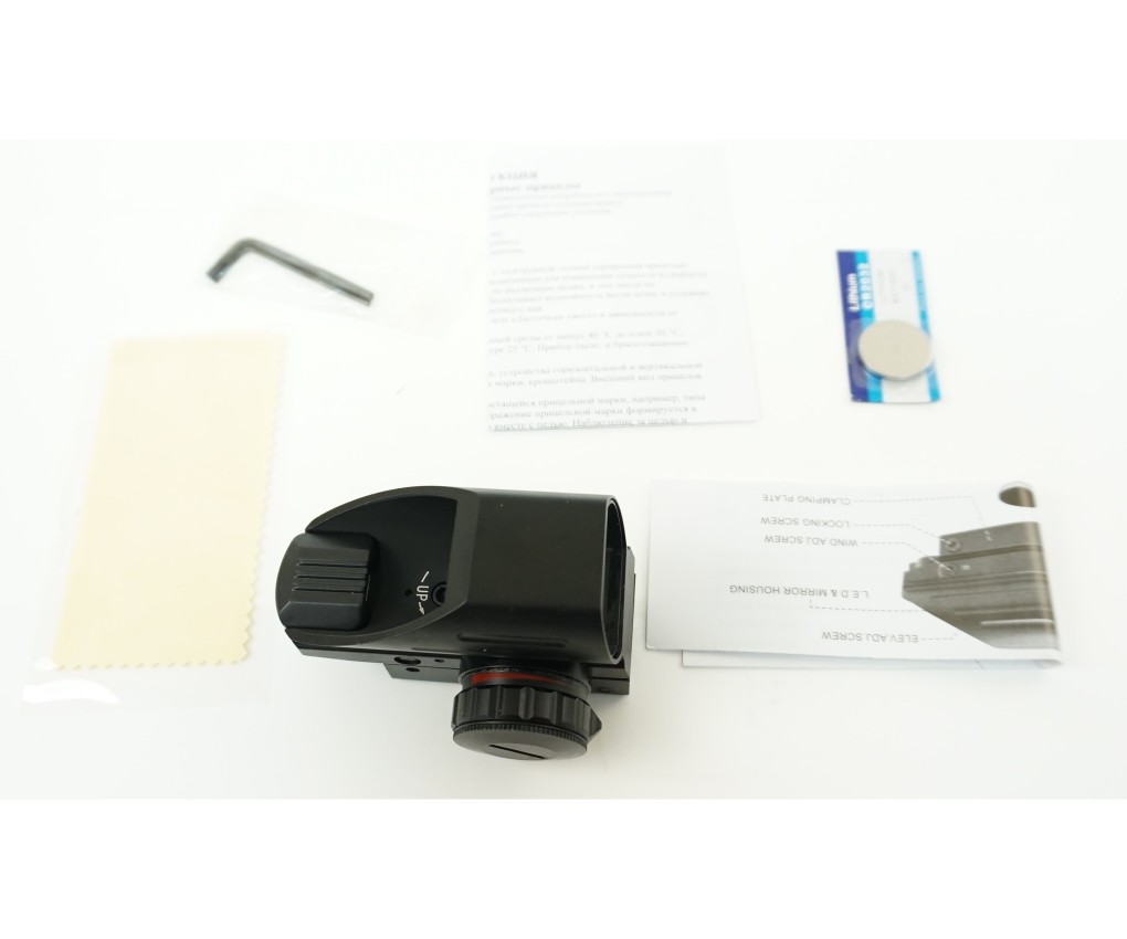 Для регулирования устройства в горизонтальной или вертикальной плоскости необходим шестигранник, включенный в комплектацию устройства. Кроме того, прицел комплектуется элементами питания, а также специальной салфеткой для ухода за оптикой. Материал изготовления устройства – легкий алюминиевый сплав. Весит прицел всего 0,18 кг, длина его – 8,5 см.