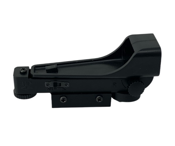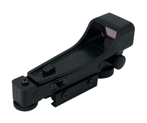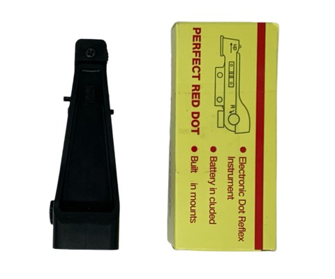 Прицел выполнен из современного полимера, планка прицела на «ласточкин хвост» металлическая. Используя удлиненные винты, прибор может быть установлен также на Вивер. В данном приборе отделение для батарейки находится под линзой, его прорезиненная крышка выступает и в качестве амортизатора. Вес прицела минимальный – всего 0,07 кг, длина – 12 см. В комплект включены батарейка, фибра и инструкция.