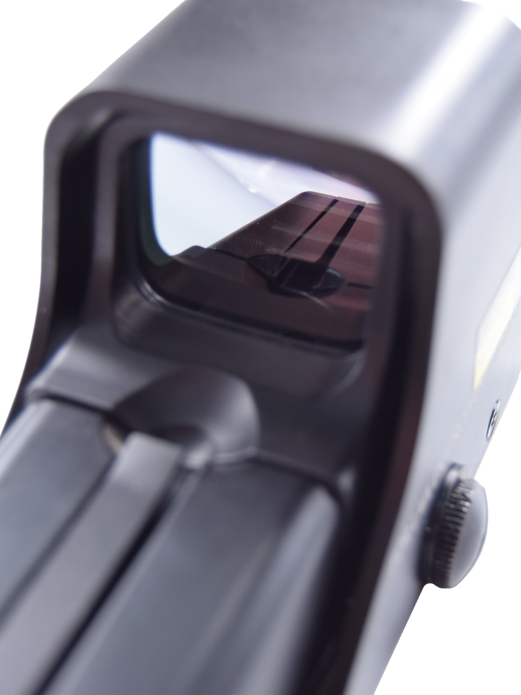EOTech 552 отличается прекрасным качеством сборки, и внешне ничем не отличается от оригинала, кроме отсутствия логотипа бренда. Интегрированный в корпус кронштейн рассчитан на установку прицельного устройства на планку Пикатинни/Вивера. Благодаря просветленной линзе прицел показывает хорошие результаты прицеливания даже в неблагоприятных условиях видимости, что важно участникам военно-тактических игр.