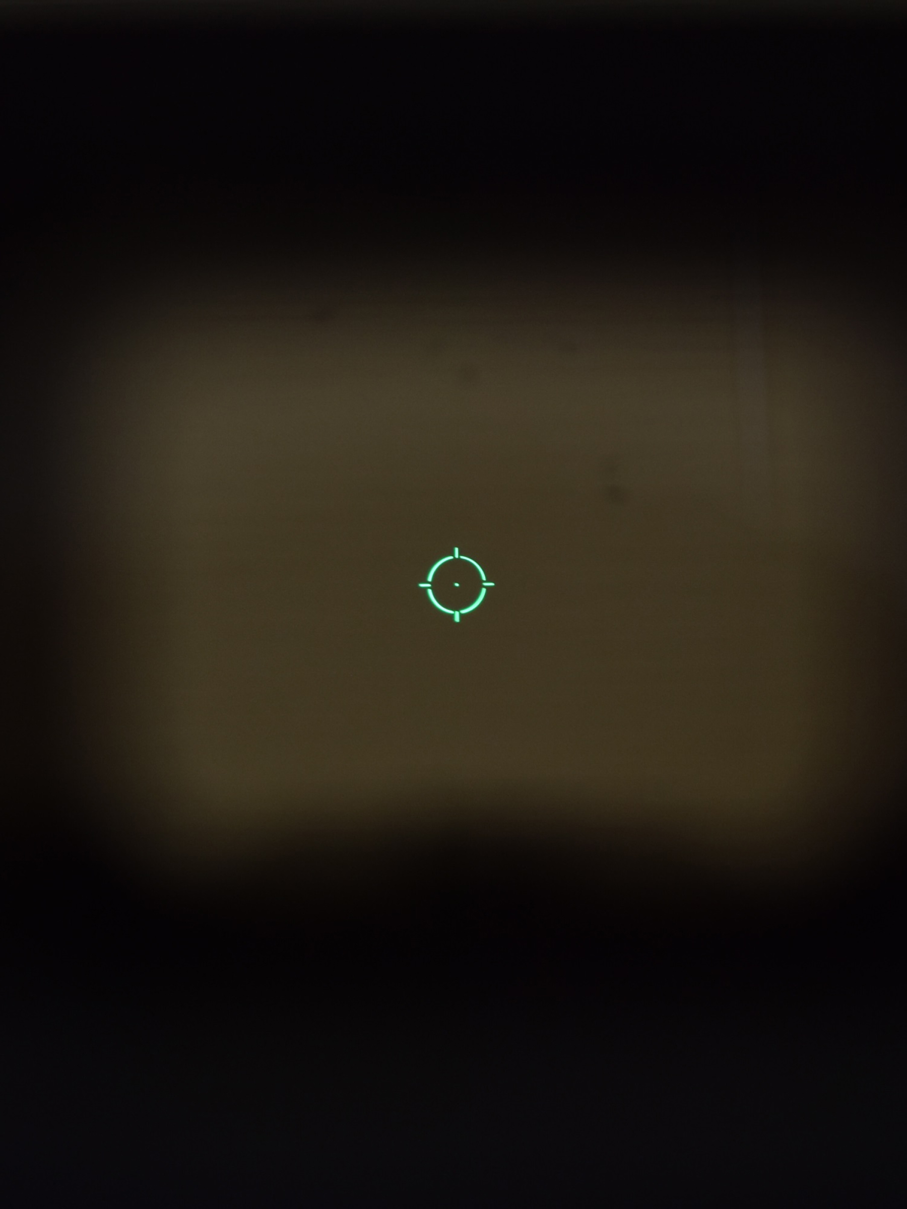 Прицельная марка реплики, в отличие от оригинальной модификации, представлена классической проекцией. Цвет прицельной марки можно установить на выбор – красный или зеленый. Имеются боковые клавиши для регулировки яркости прицельной марки. При нажатии двух клавиш одновременно происходит отключение и включение прицела. Прокручивание винтов, расположенных слева, обеспечивают отстройку прибора по вертикали и горизонтали. В передней части устройства расположен отсек для двух батареек АА-типа. Корпус прицела пластиковый, а рамка линзы изготовлена из алюминиевого сплава. Весит прицел 0,27 кг, длина – 13 см.