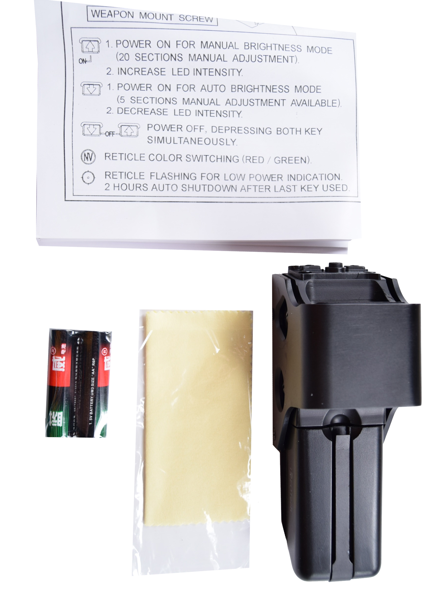 | Комплектация (?): | прицел, батарейка, микрофибра для протирки линз, шестигранный ключ, инструкция, коробка |