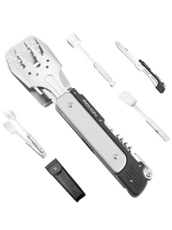 Roxon Multi BBQ Tool — полезный и компактный инструмент для приготовления мяса или других продуктов на гриле. Он представляет собою несколько отдельных инструментов, соединенных между собою. Таким образом, весь набор будет под рукою и не придется, собираясь на природу, искать все нужные инструменты по отдельности.
