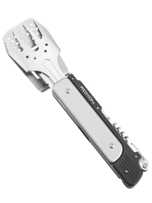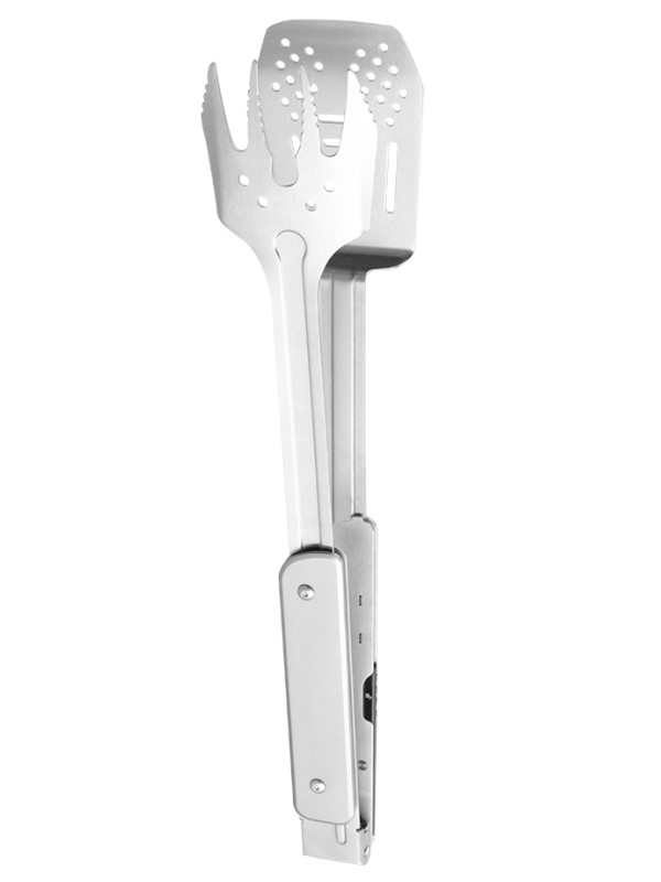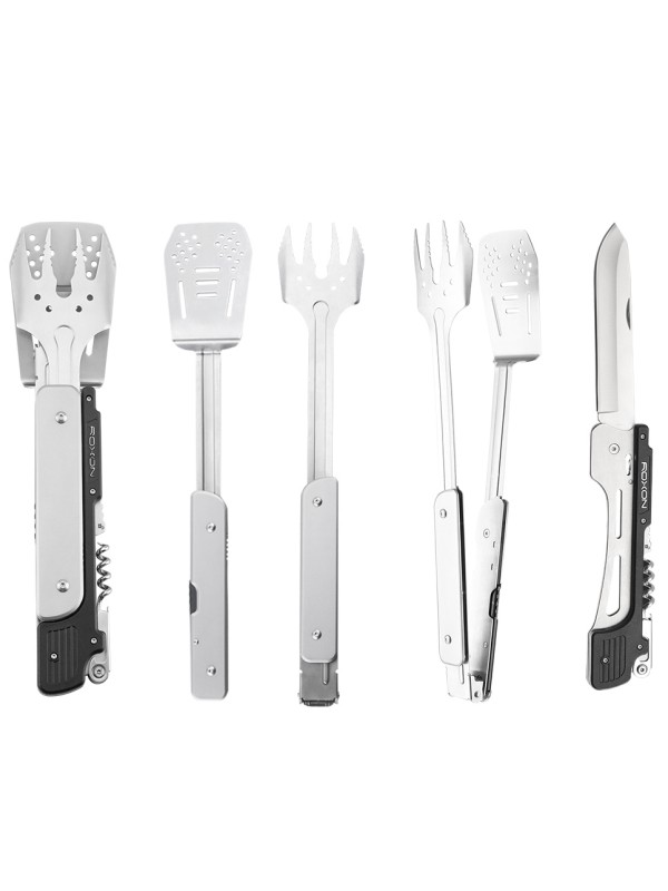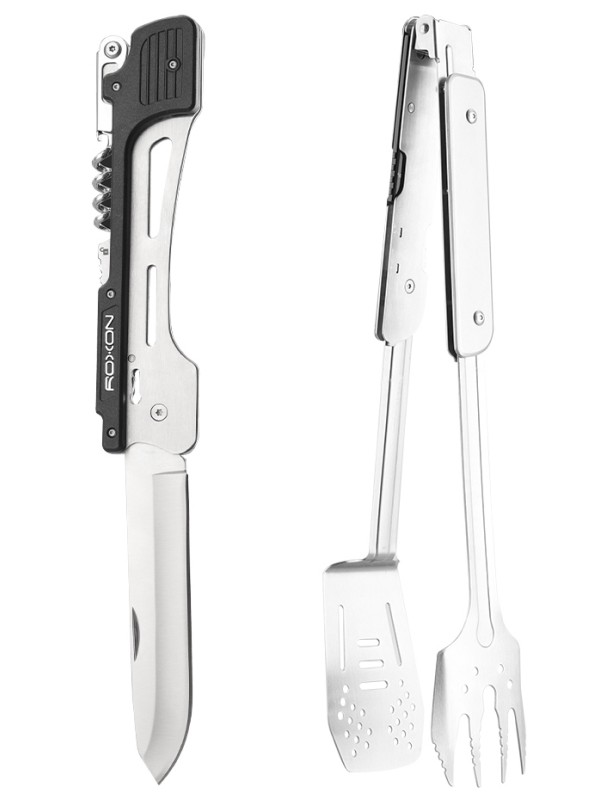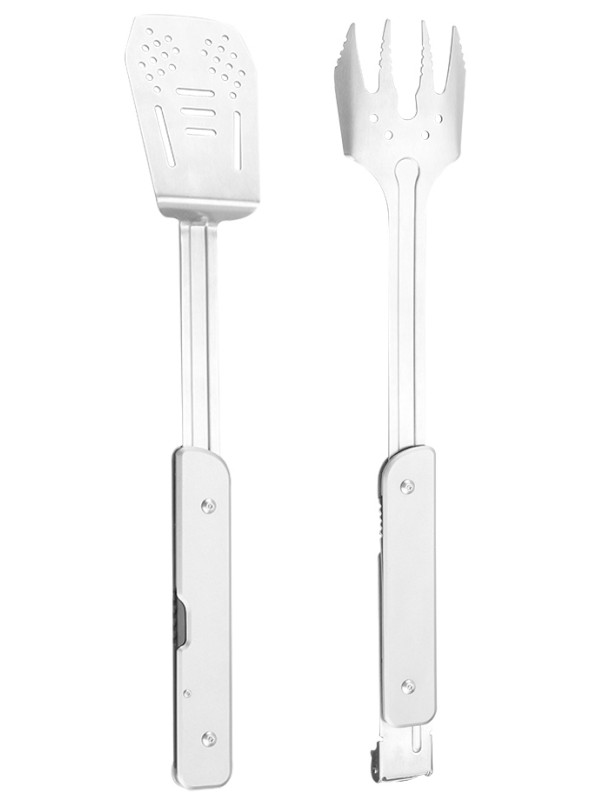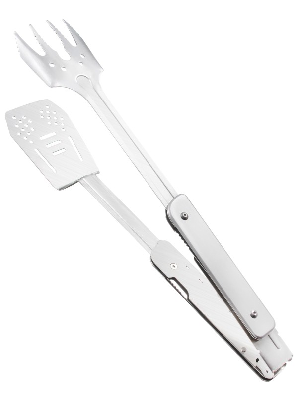 Непосредственно к ножу крепятся лопатка и вилка. Оба инструмента сделаны полностью металлическими, со складной ручкой. У вилки 4 зубчика с зазубринами, чтобы мясо не соскальзывало с нее. Есть отверстия для стекания жира. Такие же отверстия сделаны и на лопатке. Вилку с лопаткой можно соединить таким образом, чтобы они играли роль щипцов.