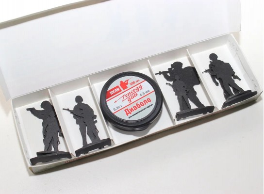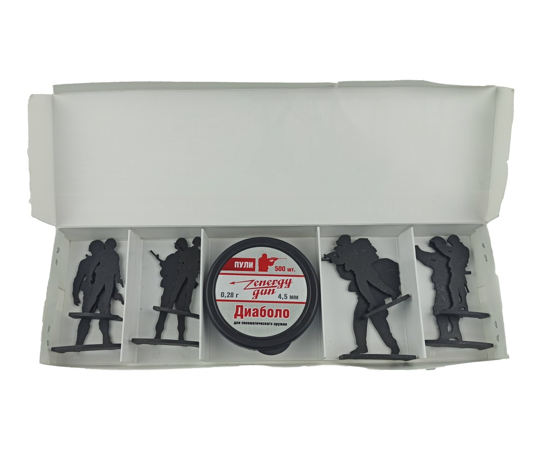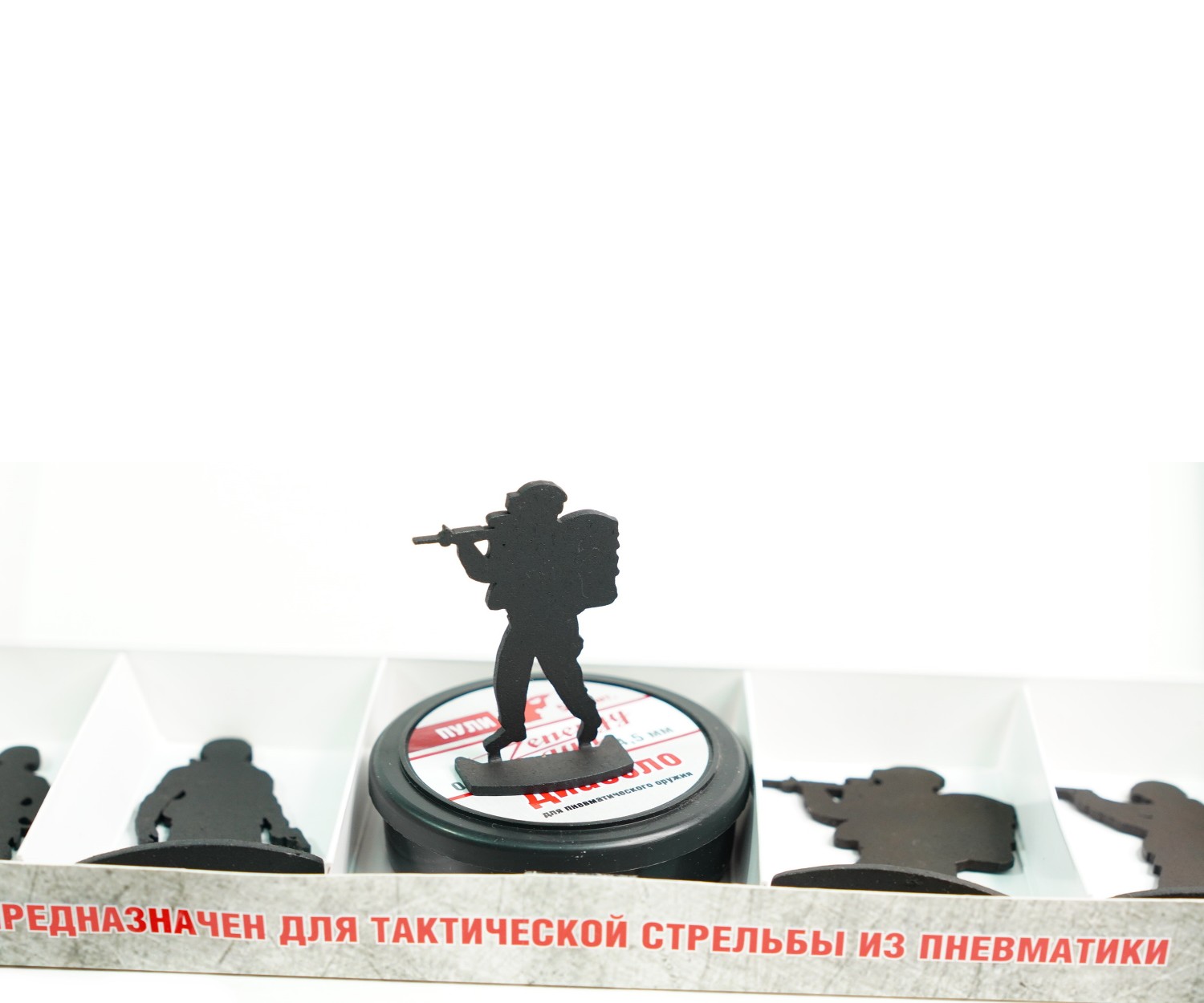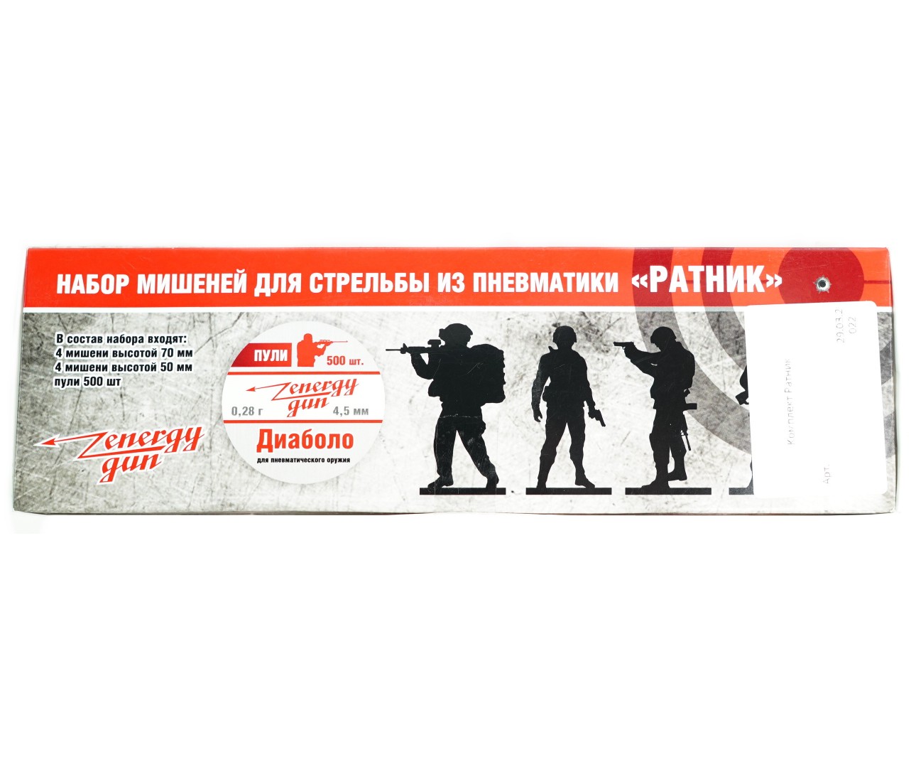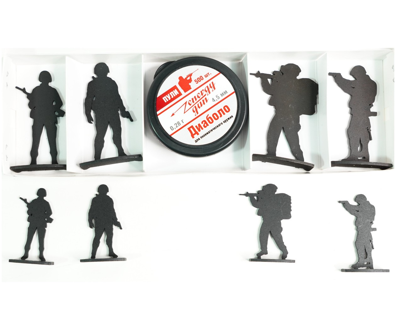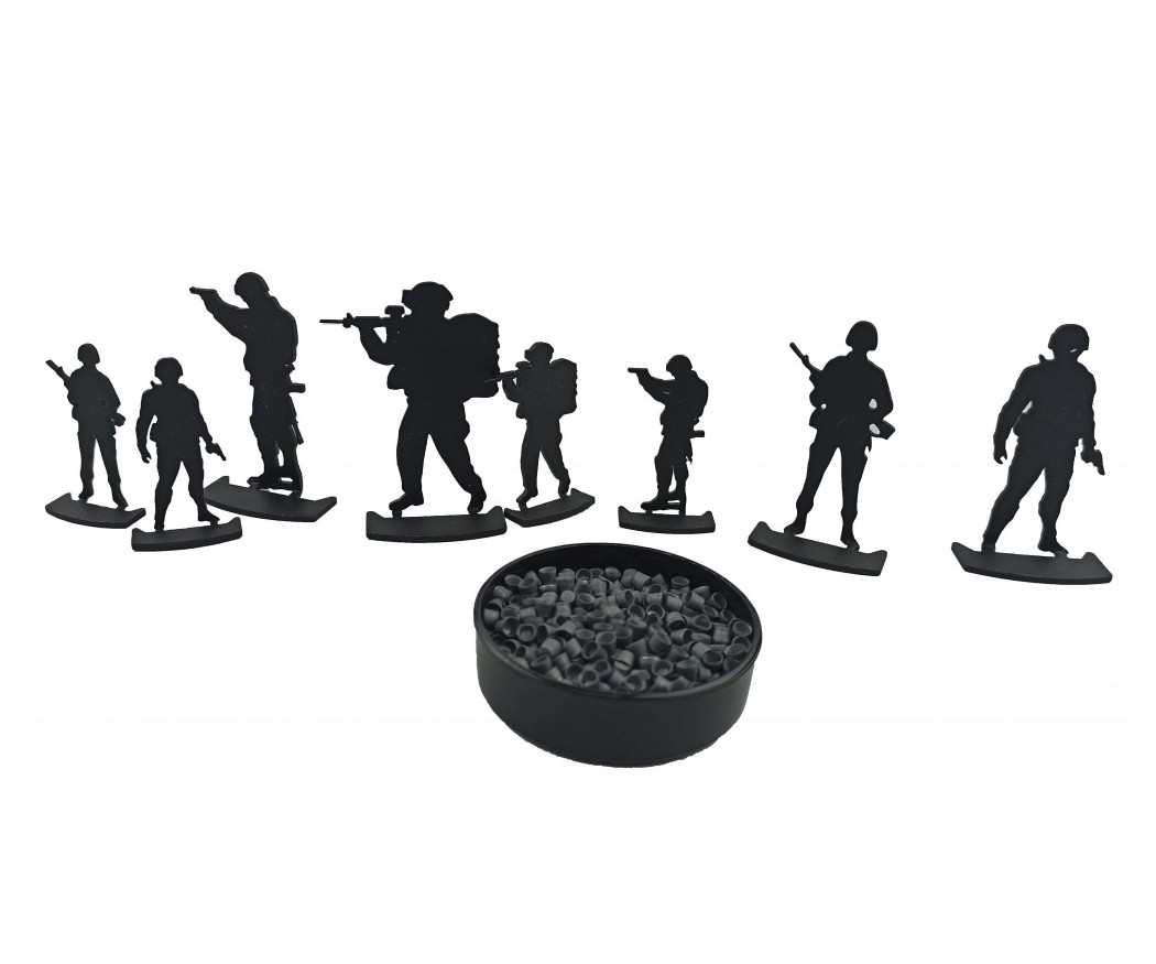 Набор мишеней «Ратник» предназначен для тактической стрельбы из пневматики. Набор включает в себя 8 металлических фигур вооруженных солдат и 500 пуль калибра 4,5 мм. Все это упаковано в удобную коробку.