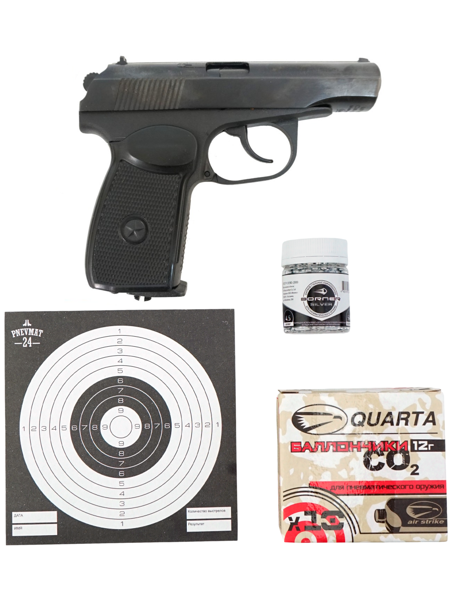 Комплектация (?): | пистолет, магазин, кольцо 10,5х1,4, кольцо уплотнительное 6х2, кольцо клапана 3,7х1,8, элемент запорный, шайба, паспорт (инструкция), 500 шариков, 10 баллончиков СО2, 50 мишеней |
