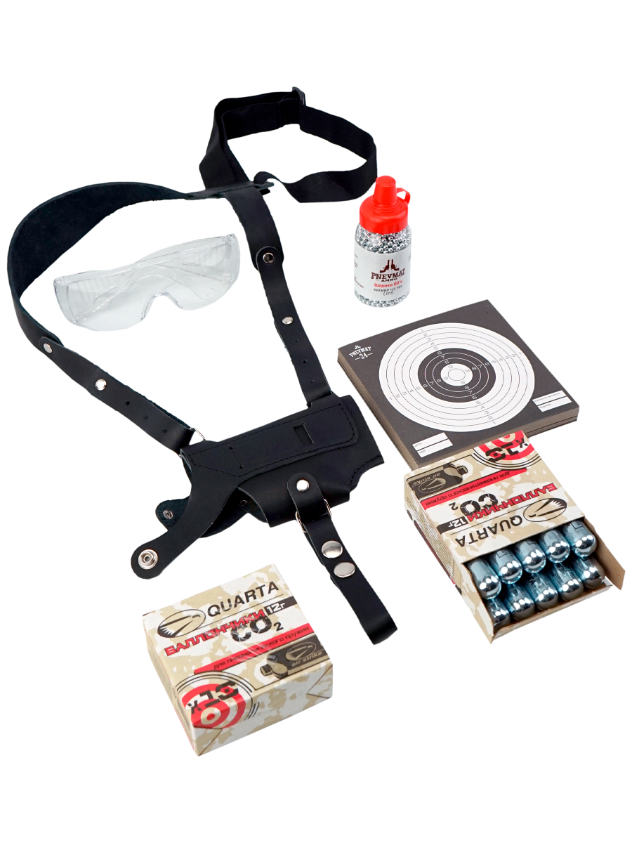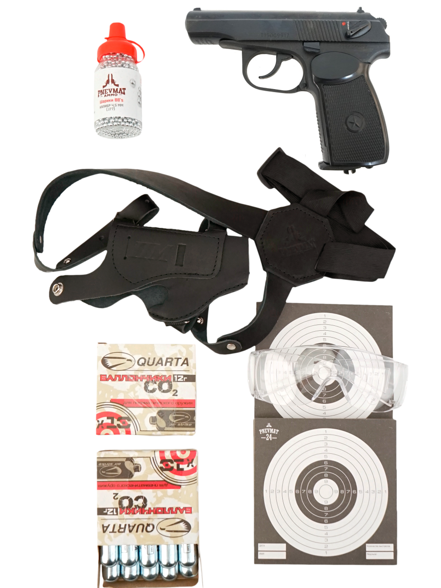 Комплектация (?): | пистолет, магазин, кольцо 10,5х1,4, кольцо уплотнительное 6х2, кольцо клапана 3,7х1,8, элемент запорный, шайба, паспорт (инструкция), 1500 шариков, 20 баллончиков СО2, 50 мишеней, кобура оперативная ПМ, очки защитные |