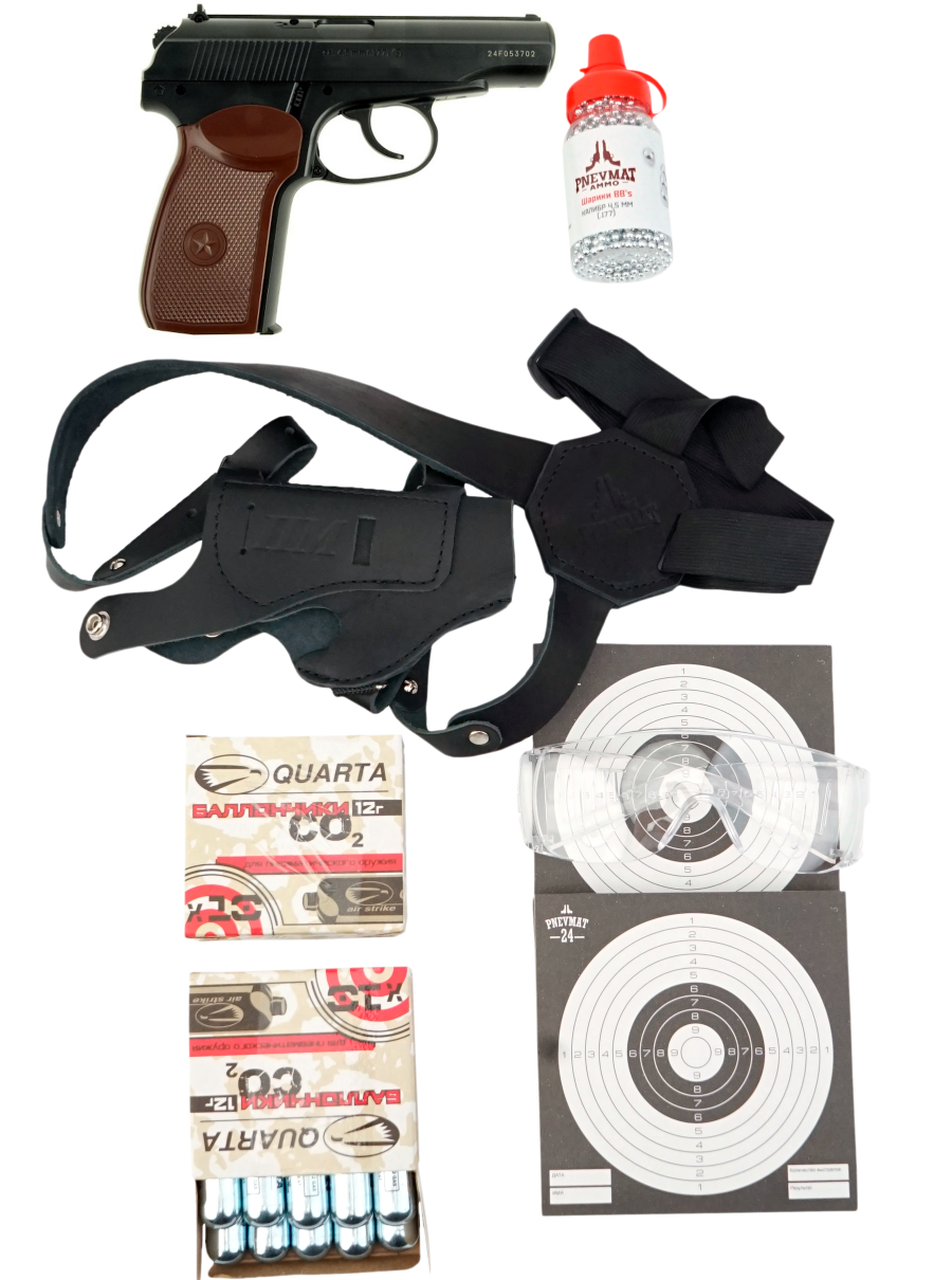 Комплектация (?): | пистолет, инструкция, 1500 шариков Pnevmat ammo, 20 баллончиков CO2, мишени - 50 шт. (черно-белые), кобура оперативная, очки защитные |