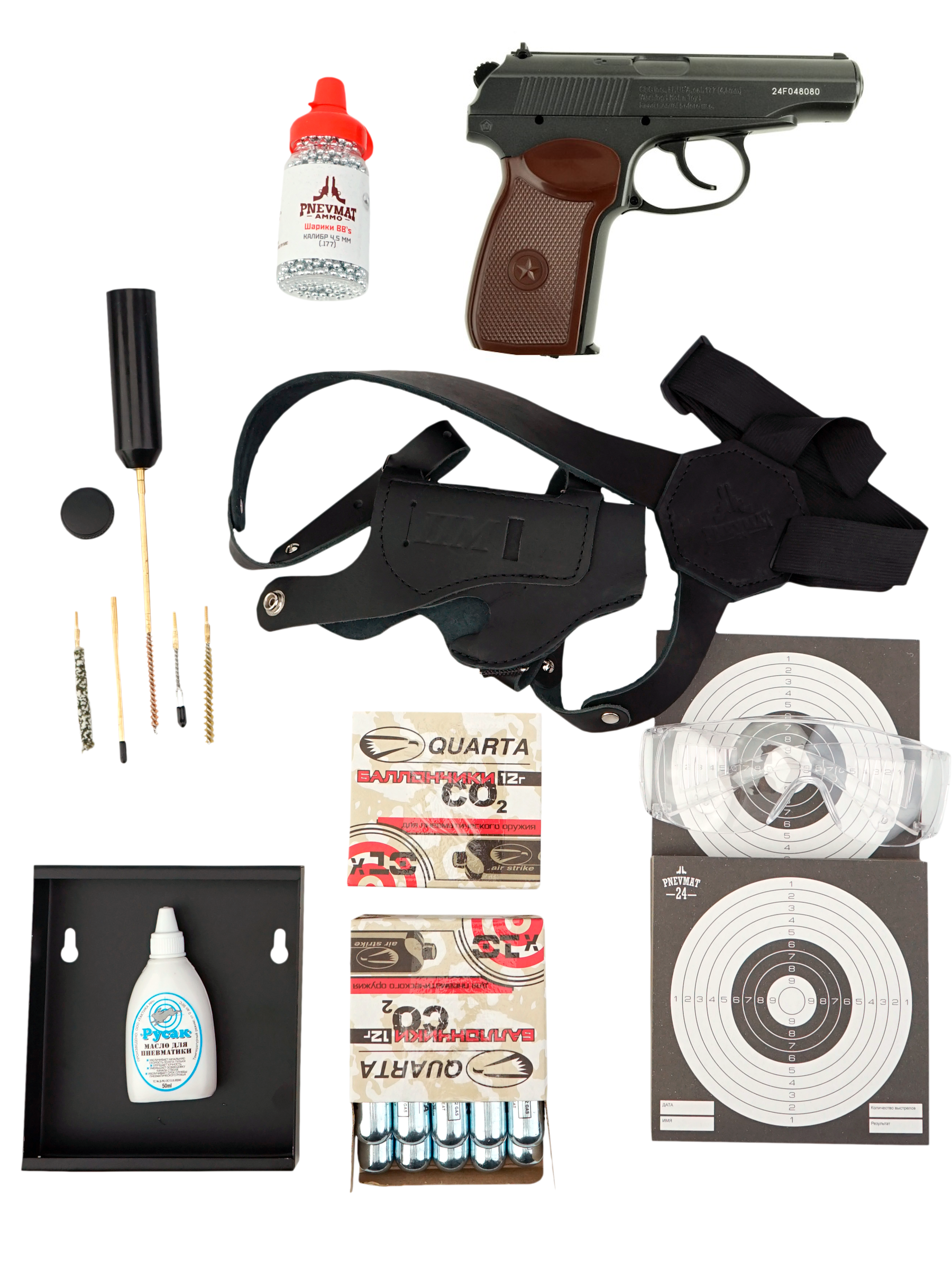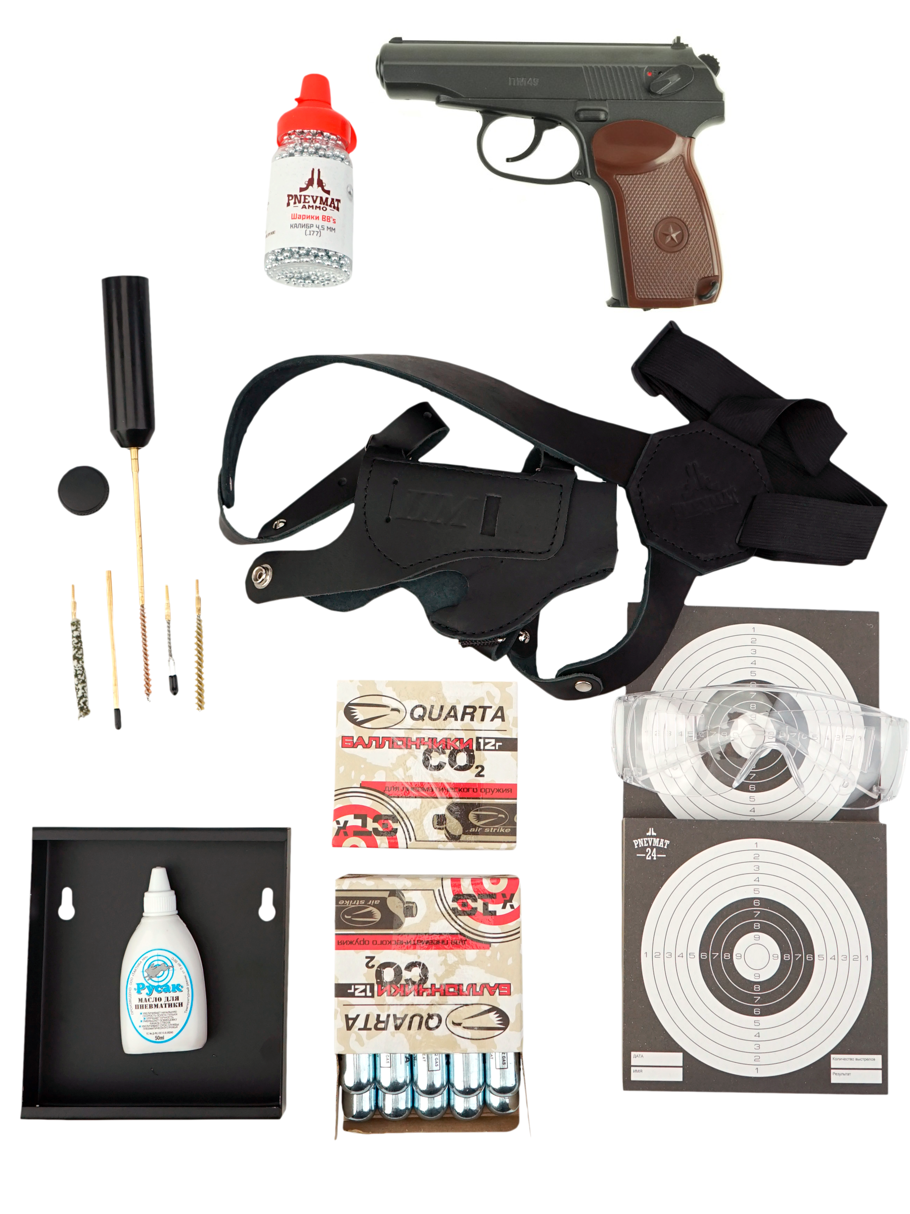 | Комплектация (?): | пистолет, магазин, инструкция, 1500 шариков, 20 баллончиков, 50 мишеней, кобура оперативная ПМ, очки защитные, масло 50мл, набор для чистки, пулеулавливатель |