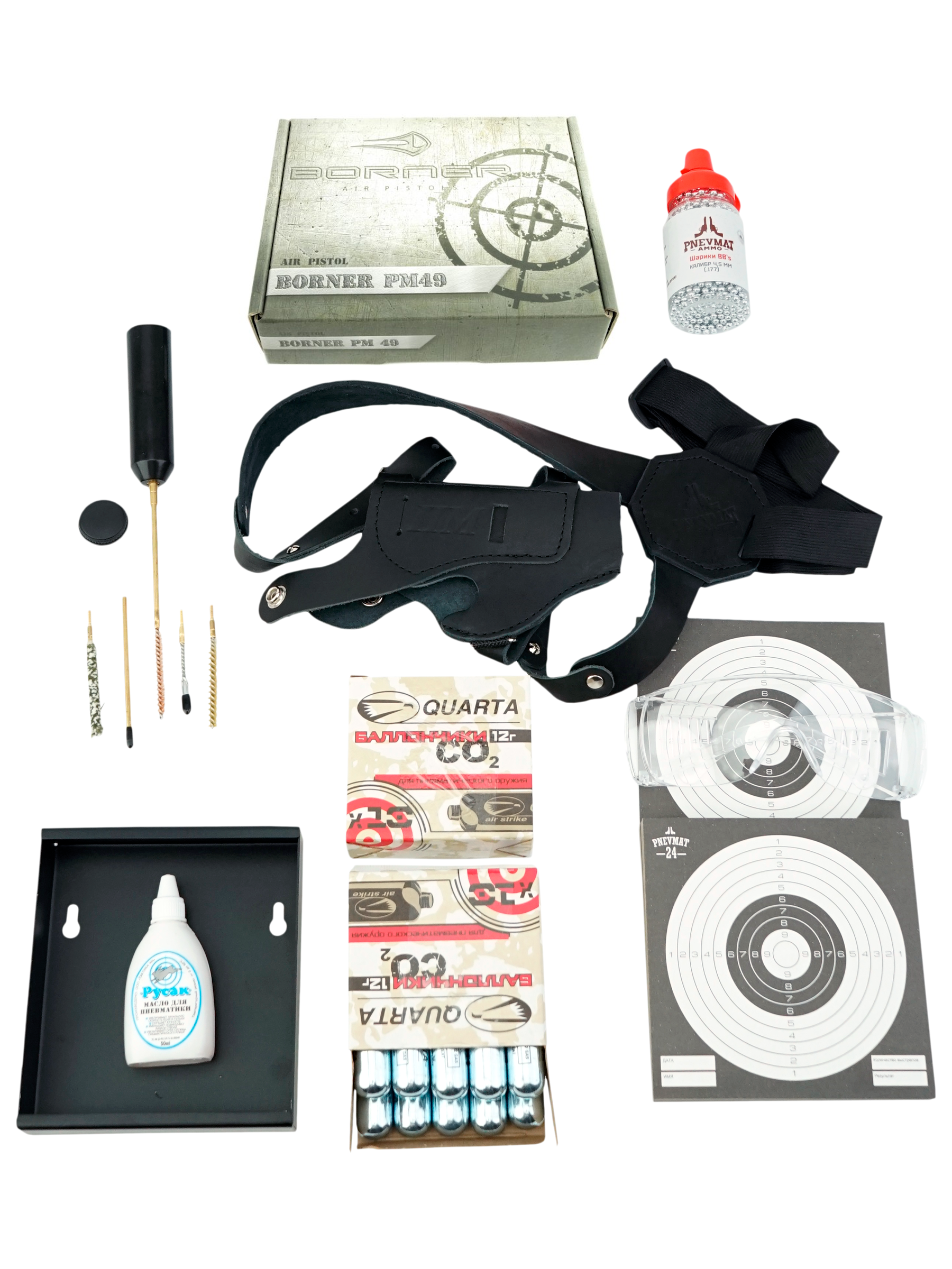 Пневматика Borner ПМ - копия всемирно известного пистолета «Макарова», сконструированного в 1949 г. Боевой аналог был на вооружении милицейских и армейских подразделений Советского Союза. Выполненная на русском инструкция облегчает эксплуатацию и знакомство с оружием. Металлический корпус и накладки из пластика на рукоятке придают оружию Borner ПМ49 стильный внешний вид. Корпус пистолета - цельный литой, позволяет взводить спусковой курок при неподвижности рамы.
