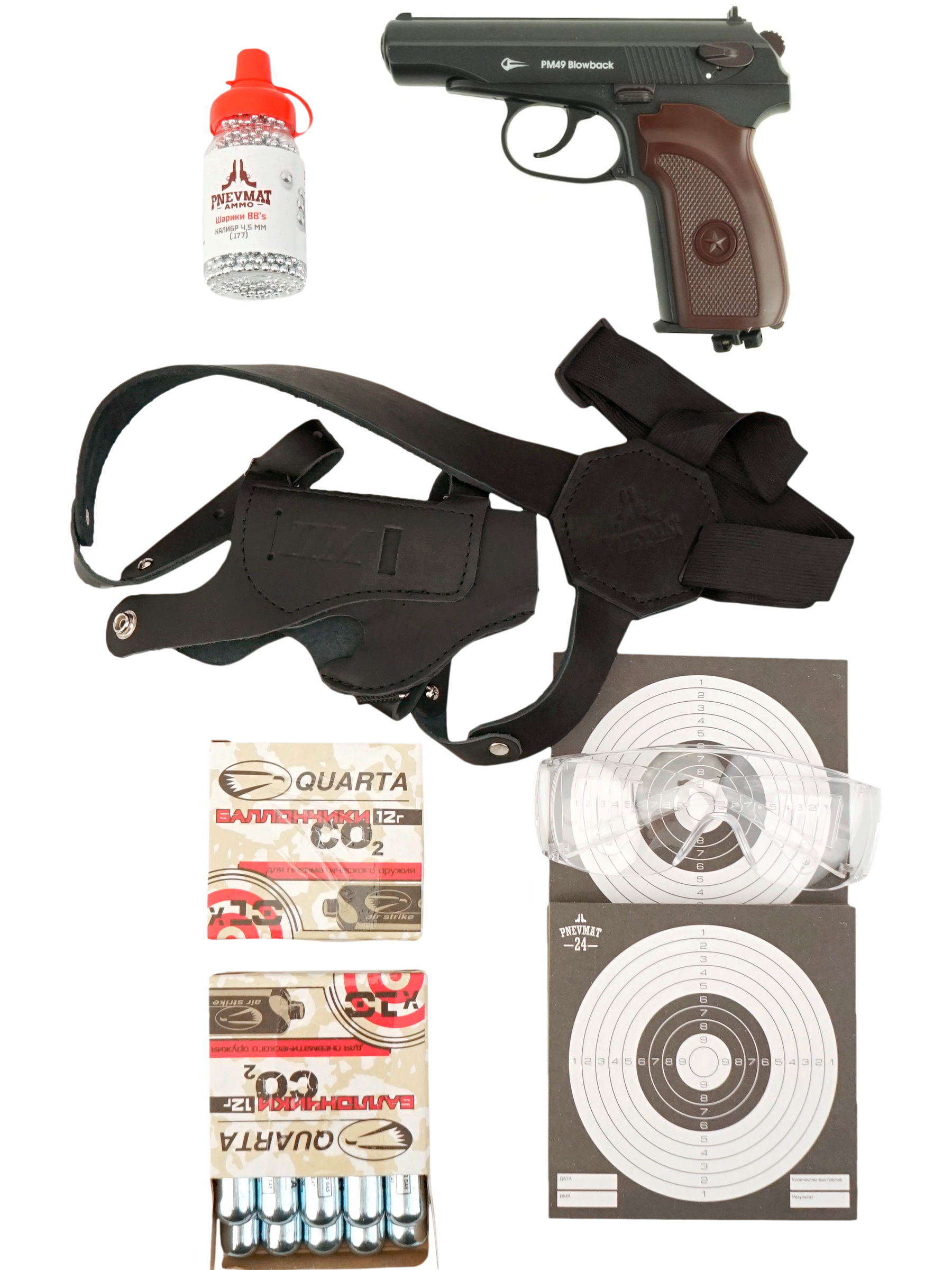 | Комплектация (?): | пистолет, магазин, инструкция, 1500 шариков, 20 баллончиков СО2, 50 мишеней, кобура оперативная ПМ, очки защитные |