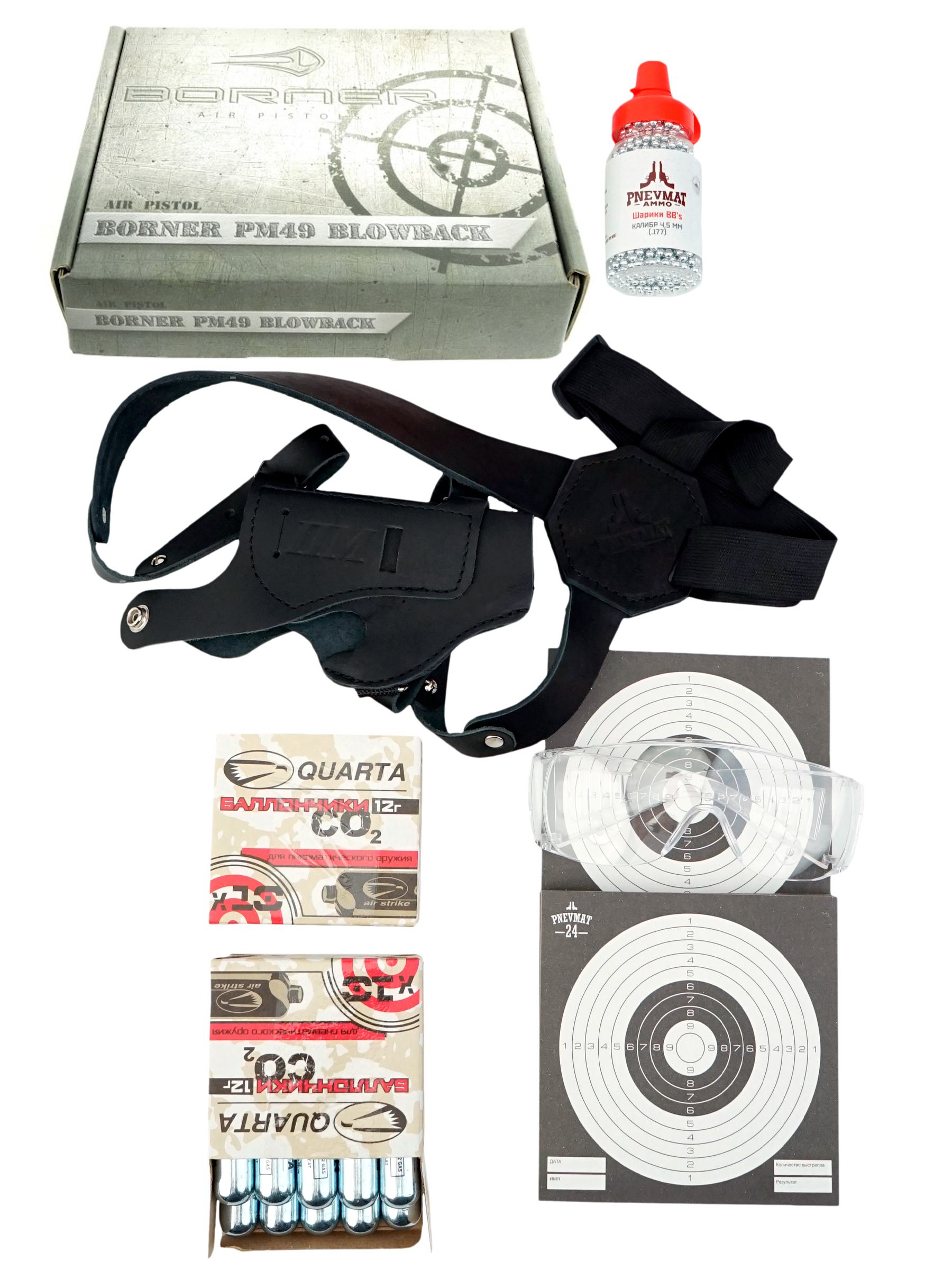 Пневматика Borner ПМ - копия всемирно известного пистолета «Макарова», сконструированного в 1949 г. Боевой аналог был на вооружении милицейских и армейских подразделений Советского Союза. Выполненная на русском инструкция облегчает эксплуатацию и знакомство с оружием. Металлический корпус и накладки из пластика на рукоятке придают оружию Borner ПМ49 Blowback стильный внешний вид. Корпус пистолета - цельный литой, позволяет взводить спусковой курок при неподвижности рамы.