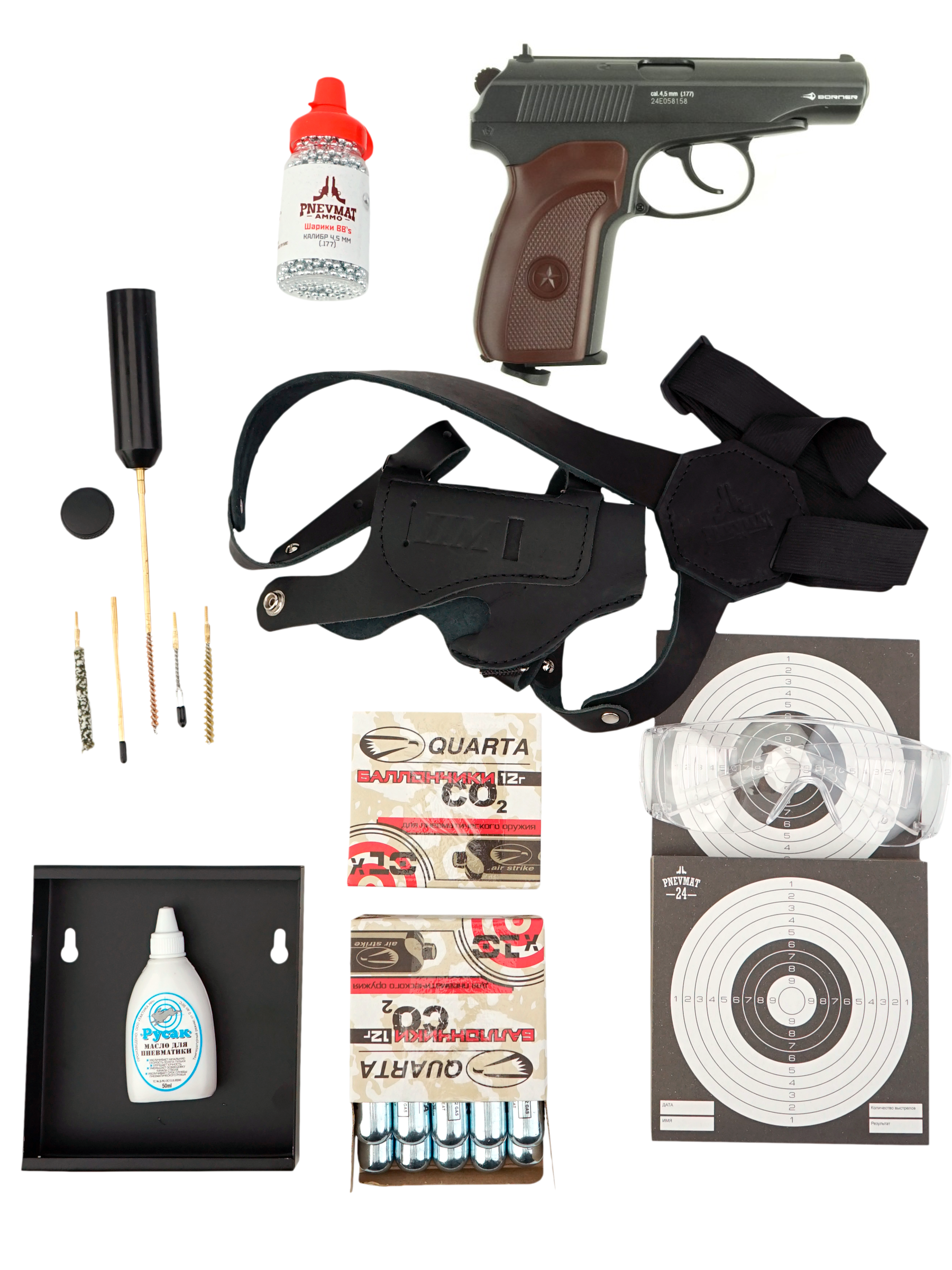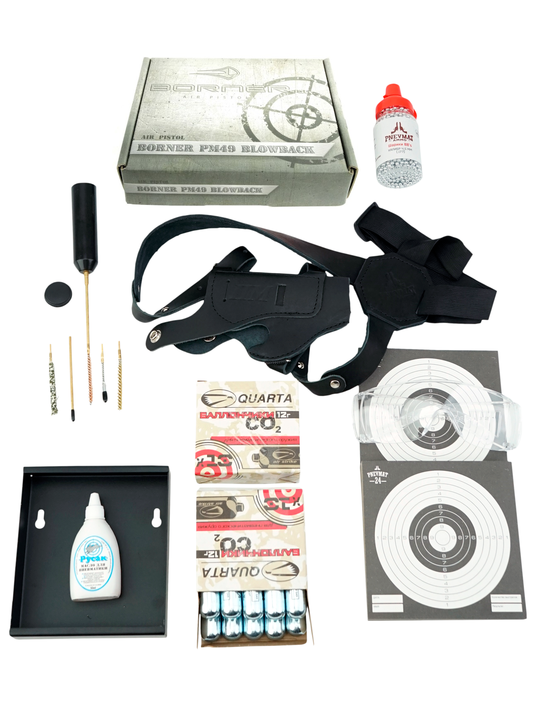 | Комплектация (?): | пистолет, магазин, инструкция, 1500 шариков, 20 баллончиков СО2, 50 мишеней, кобура оперативная ПМ, очки защитные, масло 50мл, средство для чистки, пулеулавливатель |
