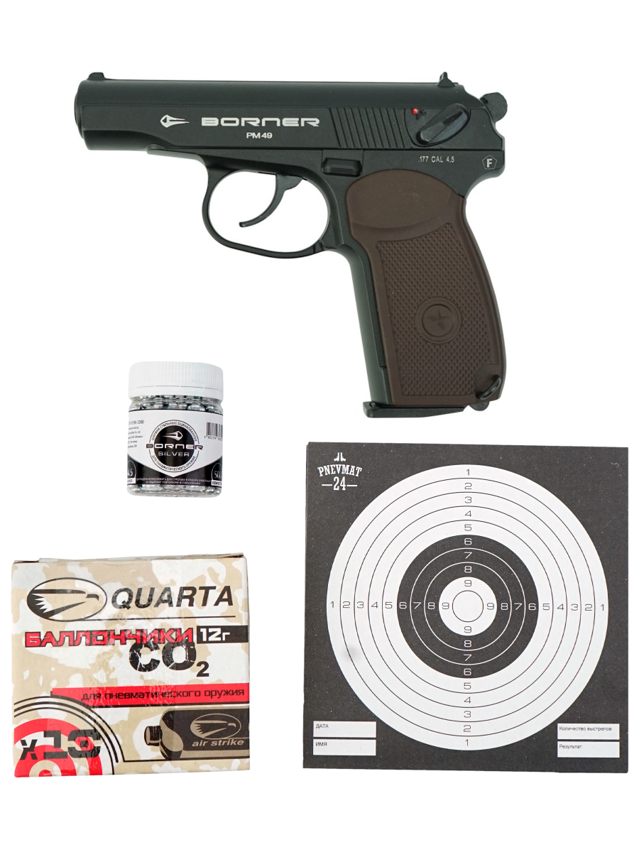 Пневматика Borner ПМ - копия всемирно известного пистолета «Макарова», сконструированного в 1949 г. Боевой аналог был на вооружении милицейских и армейских подразделений Советского Союза. Выполненная на русском инструкция облегчает эксплуатацию и знакомство с оружием. Металлический корпус и накладки из пластика на рукоятке придают оружию Borner ПМ49 стильный внешний вид. Корпус пистолета - цельный литой, позволяет взводить спусковой курок при неподвижности рамы.