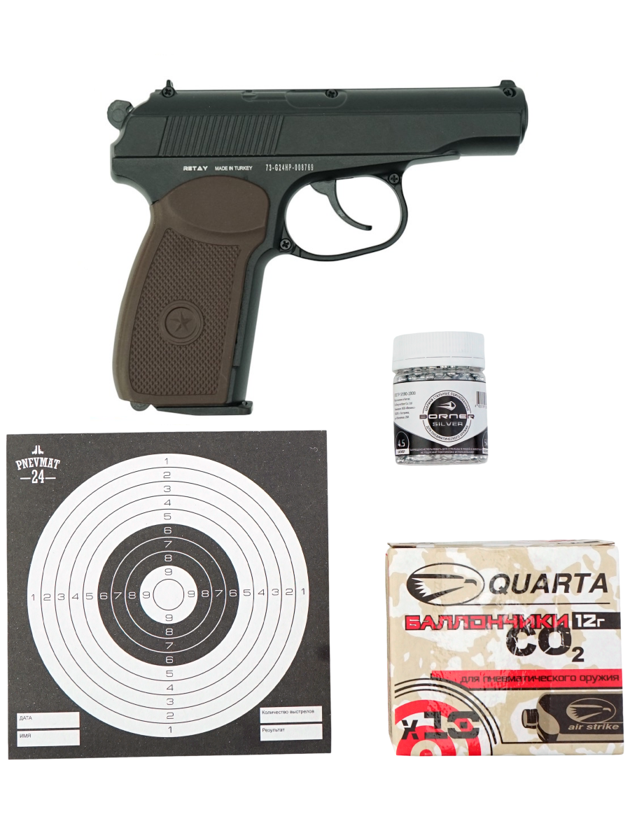 Комплектация (?): | пистолет, цельный магазин, инструкция, 500 шариков, 10 баллончиков СО2, 50 мишеней |