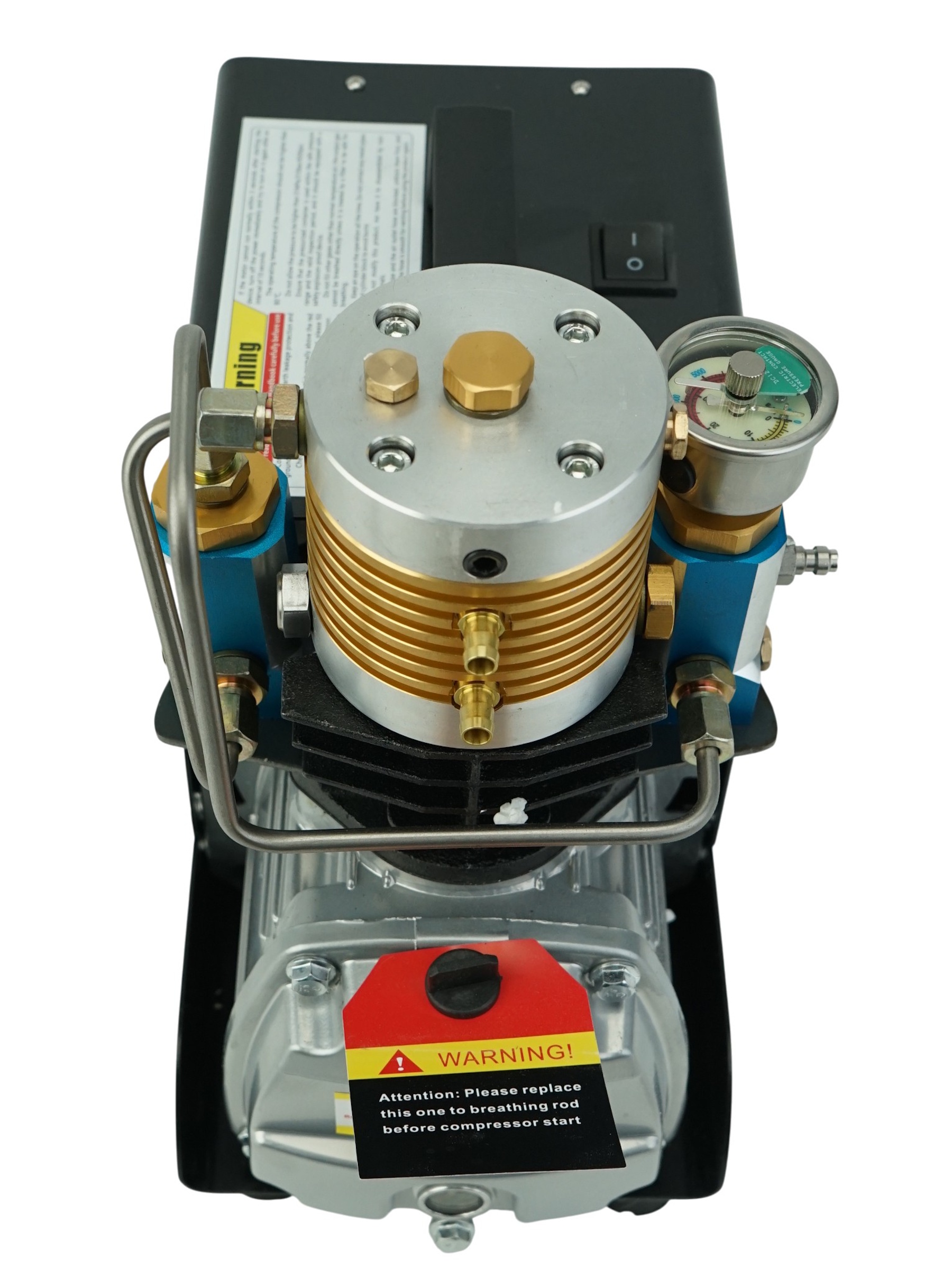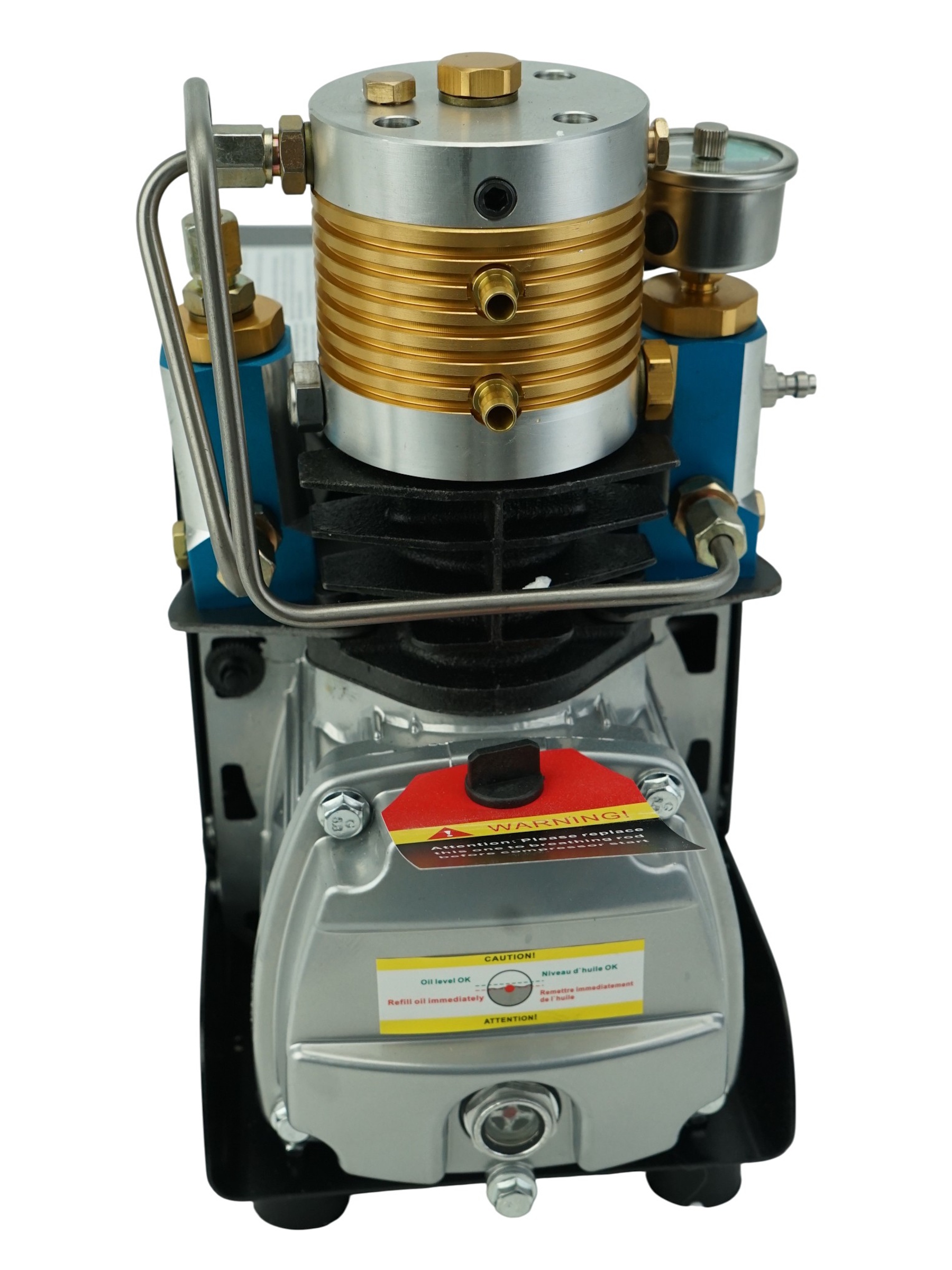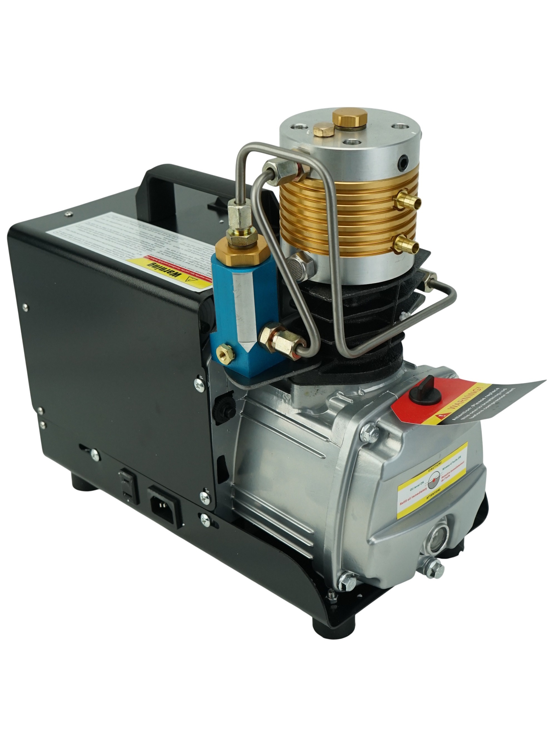 Компрессор ВД 220В 1.8 кВт (модель 010). С жидкостным охлаждением цилиндра ВД нового образца, с дополнительными боковыми сепараторами, с автоматическим отключением при заданном давлении, с предохранительной разрывной мембраной ВД.