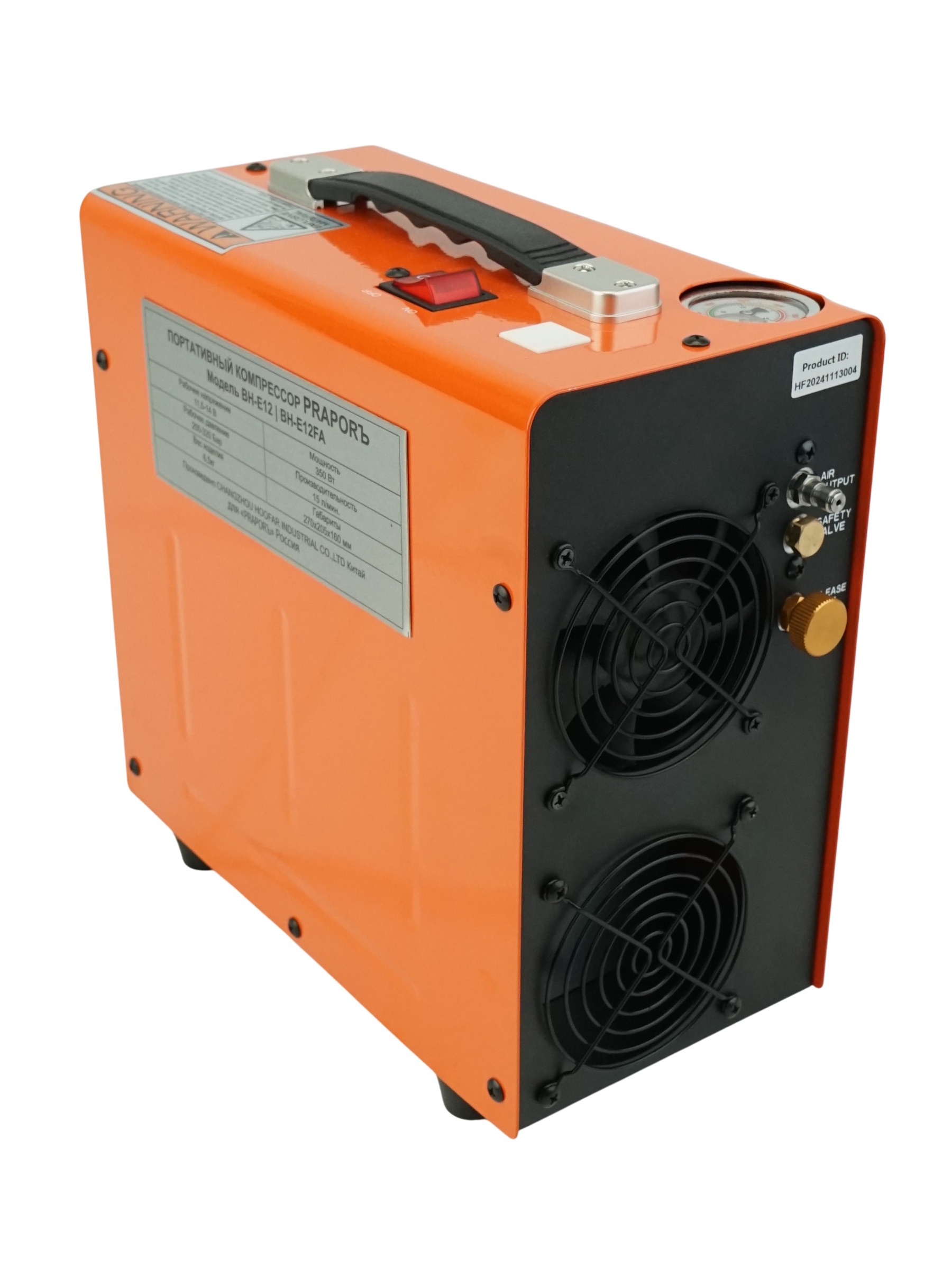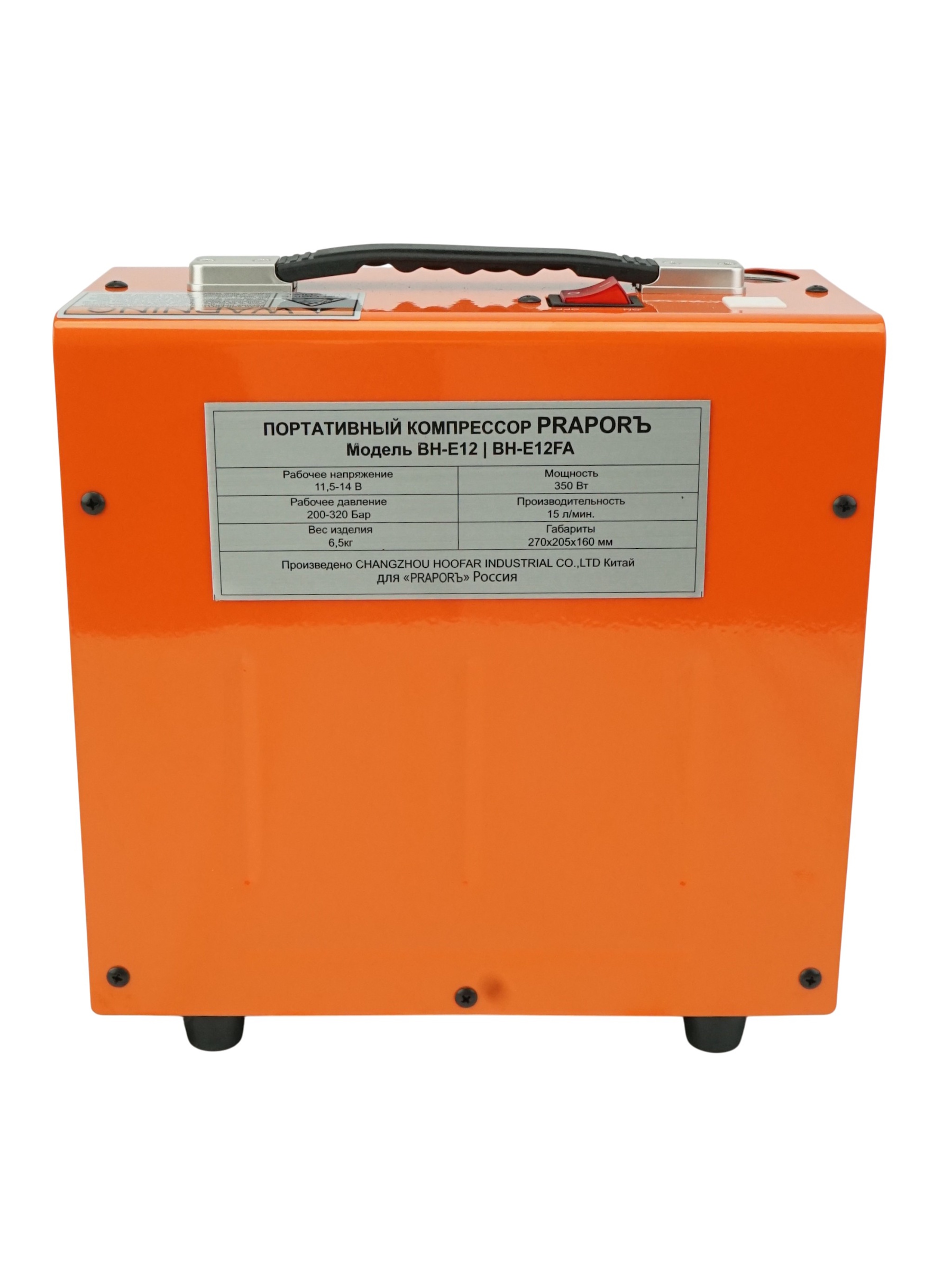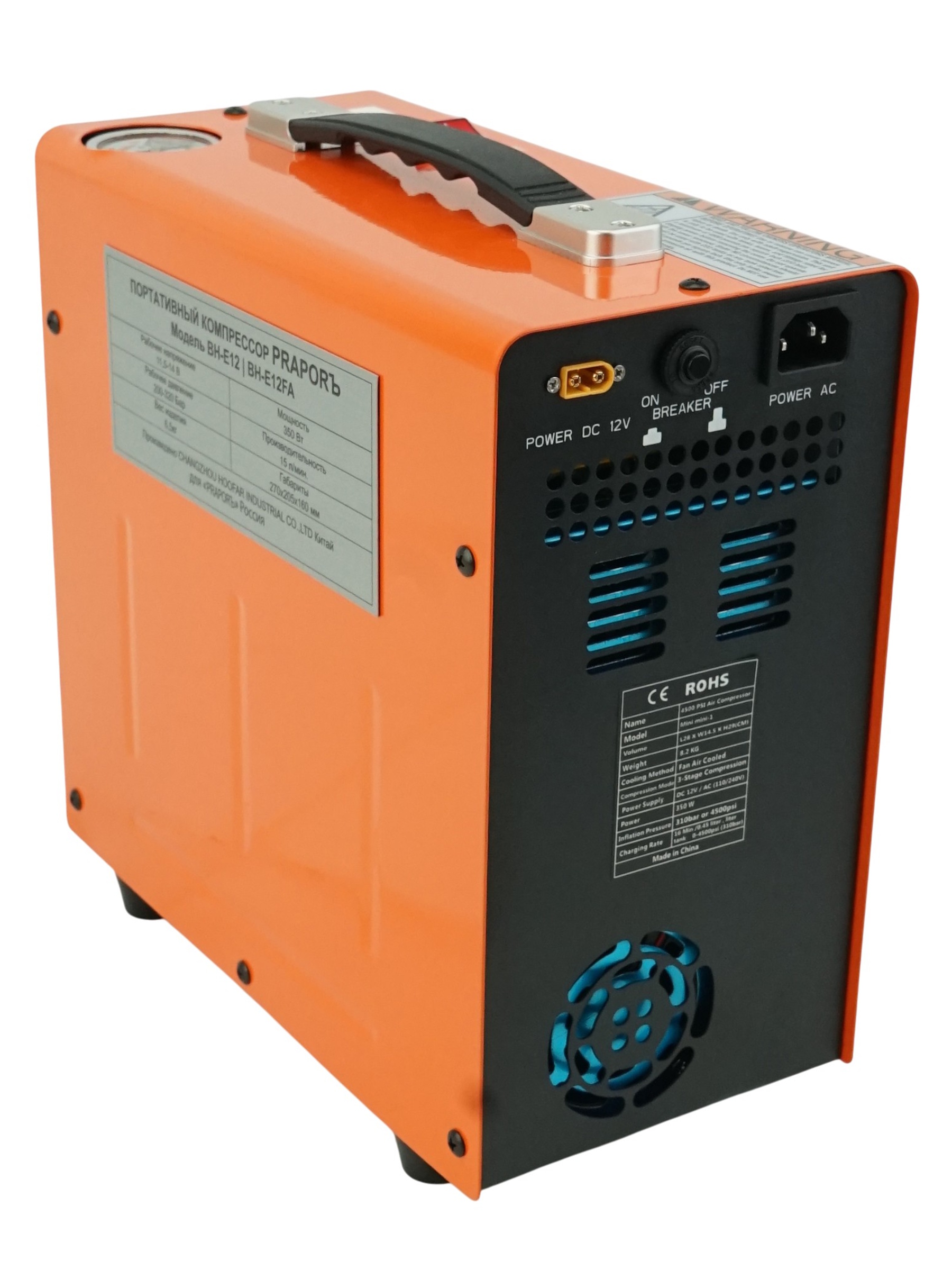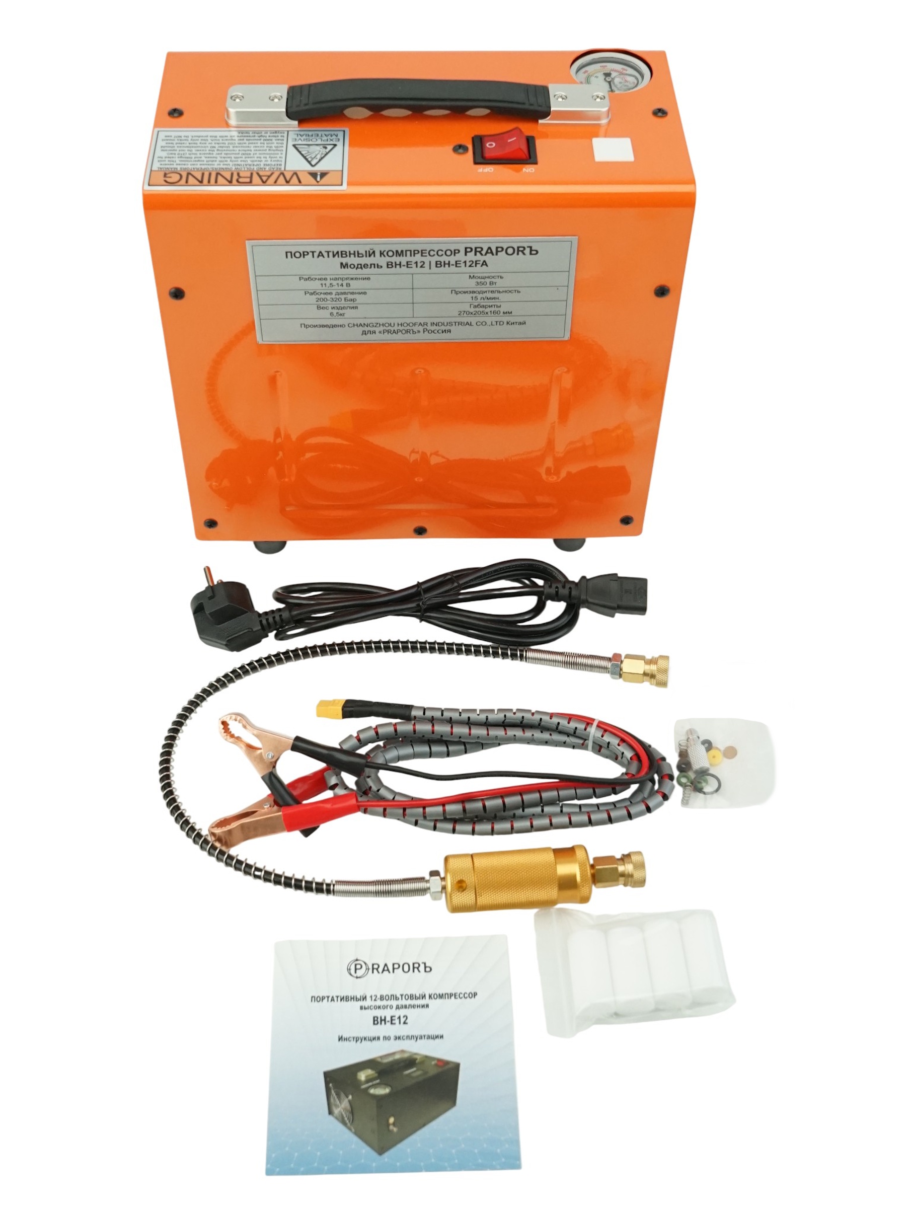 Электрический компрессор PRAPORЪ BH-E12Q 220/12 Вольт (встроенный блок питания). Компрессор предназначен для заправки резервуаров воздухом до 0,5 литра и способен нагнетать давление до 300 Бар. Увеличенная производительность на 15%.