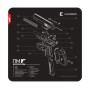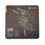 Коврик для обслуживания оружия изготовлен из матового черного неопрена с прочной нескользящей резиновой основой. Использование таких материалов исключает скольжение и потерю деталей. Помимо этого, мат превосходно впитывает излишки масел и растворителей, сохраняя поверхность стола чистой и сухой.