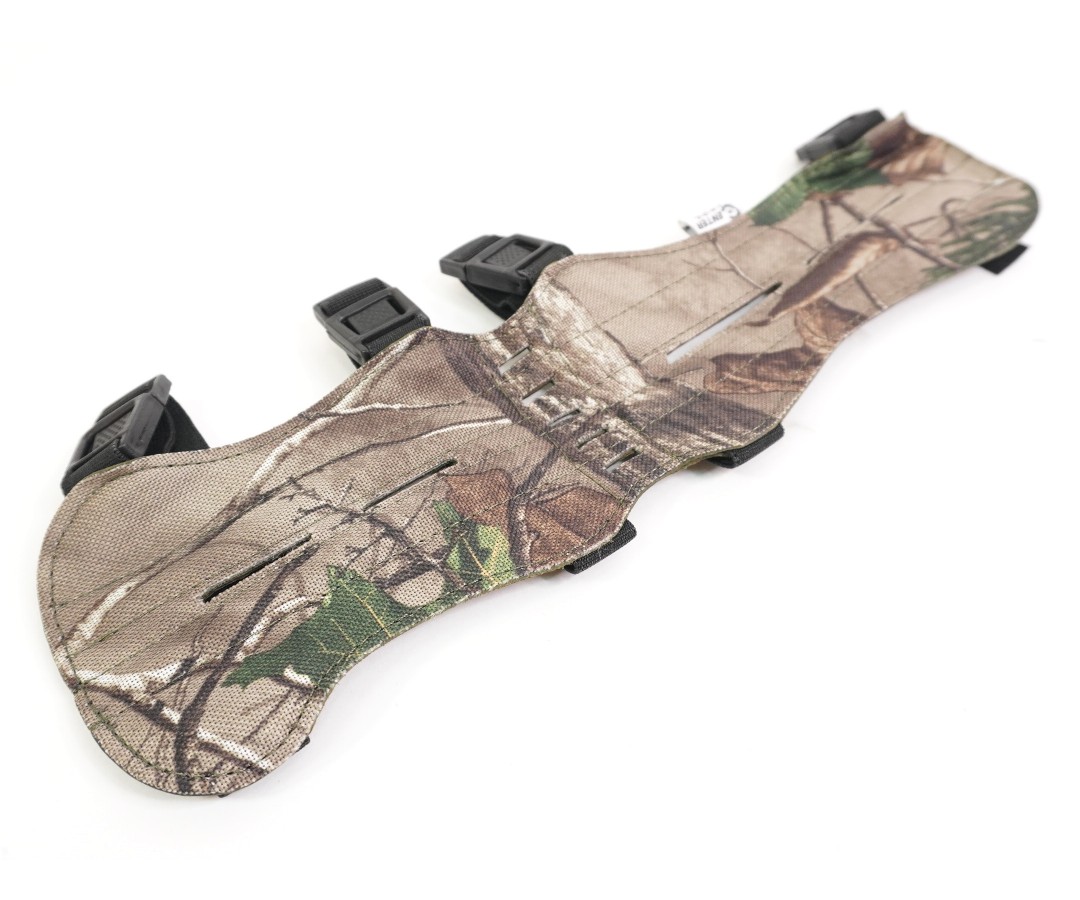 Крага из камуфлированой эко-кожи с ребрами жесткости. Защищает предплечье и локоть. Для ношения при стрельбе из блочных луков. Крепится на карабинах.