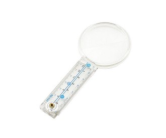 Лупа с раскладной ручкой, увеличение 3х, диаметр линзы 60 мм, на ручке проградуирована измерительная шкала до 13 см.