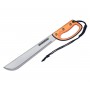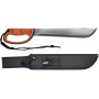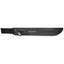 Рукоятка выполнена из комбинированного материала – полимер и резина. На тыльнике рукоятки есть отверстие под страховочный шнур, он идет в комплекте с мачете, как и ножны. Материал ножен – кордура, они долговечны и не боятся влаги. Мачете легко фиксируется в ножнах при помощи кнопки. Весит инструмента 0,66 кг, длина клинка 33 см, длина мачете – 50 см.