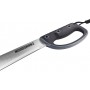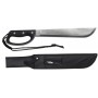 Методом лазерной гравировки на клинок нанесено название данной модели. Обух мачете прямой. Внимания заслуживает и рукоятка мачете – она эргономичной формы, с кольцеобразной гардой для защиты руки, и выполнена из полимерного материала с резиновыми вставками. Навершие рукоятки в верхней ее части оснащено темляком из нейлонового шнура, позволяющем удобно фиксировать мачете на запястье руки.