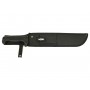 Монтаж рукояти – full tang – предусматривает накладки, полностью дублирующие параметры хвостовика и закрепленные к основе с помощью заклепок. На тыльнике предусмотрено отверстие для продевания страховочного шнура. Для лучшего хвата рукоять оборудована ярко выраженными передним и задним подпальцевыми упорами. В комплект входит чехол из кордура с креплением на ремень.