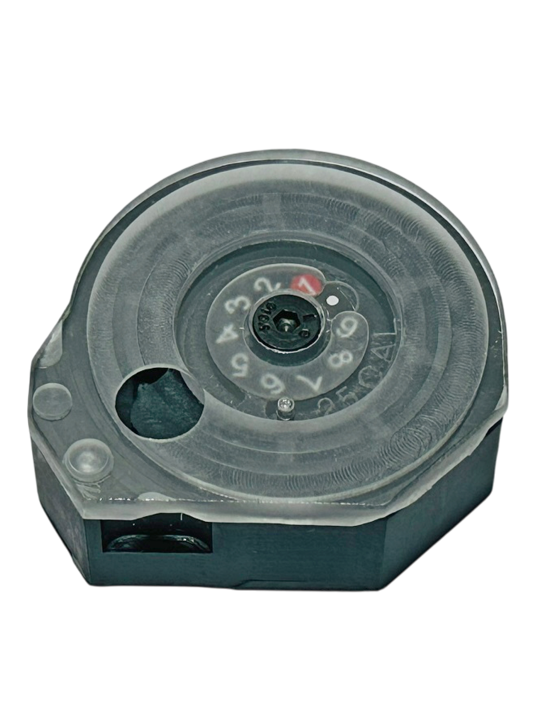 Автоматический запасной магазин барабанного типа формата Марадер для пневматических PCP-винтовок. Предназначен для заряжания пулями, калибра 6,35 мм, вместимость составляет 9 пуль. Проточенное стекло позволяет использовать длинные полнотелые пули.