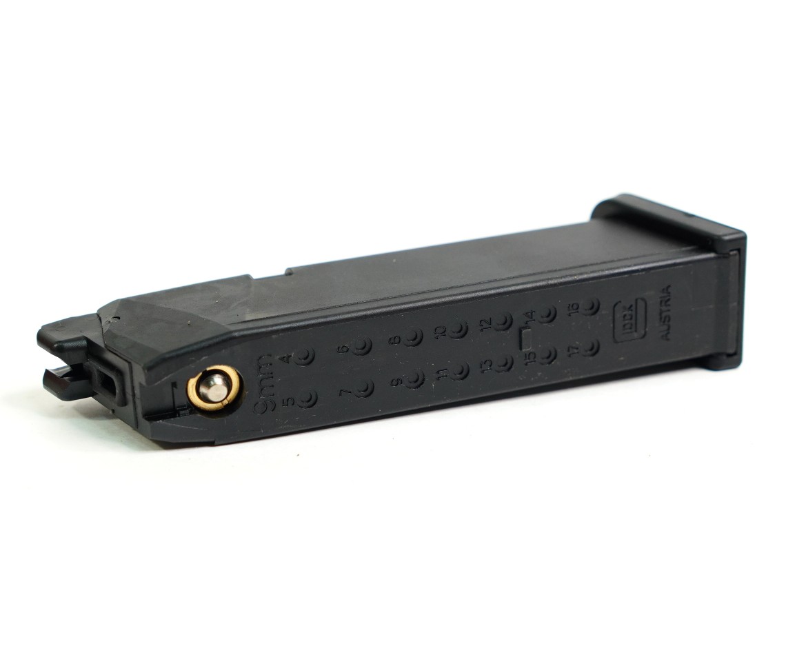 Запасной магазин для страйкбольного пистолета Glock 17 (на грин-газе), вместимость составляет 25 шариков.